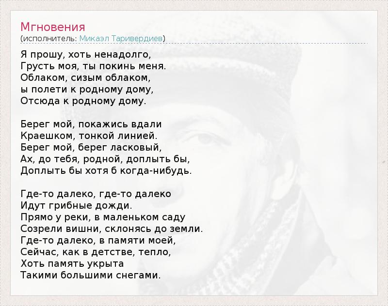 Это интересно:«Главный тон, главный звук этой музыки — это ностальгия о чём-то. Даже когда эта музыка рождалась, в том числе в те годы, когда Микаэл Таривердиев вошел в профессиональное искусство, эта музыка была как бы несовременной, хотя он считался самым современным композитором. Но и тогда его мелодии, его напевы были ностальгией по чему-то. По чему-то идеальному». Сергей СоловьёвМикаэл... продолжение