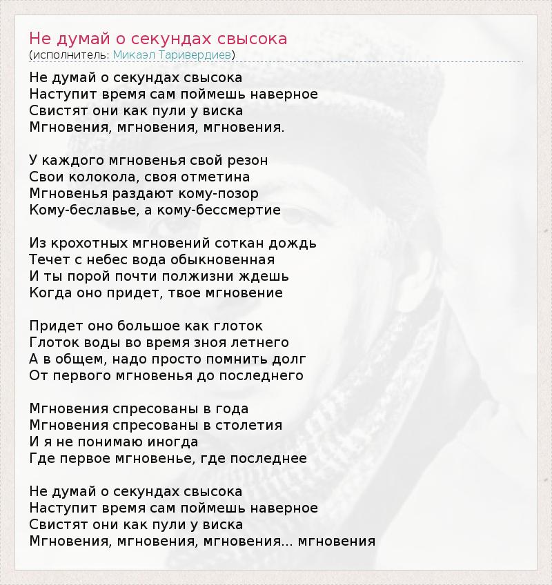 Не думай о секундах свысока Наступит время сам поймешь наверное Свистят они как пули у виска Мгновения, мгновения, мгновения. У каждого мгновенья свой резон Свои колокола, своя отметина Мгновенья раздают кому-позор Кому-беславье, а кому-бессмертие Из крохотных мгновений соткан дождь Течет с небес вода обыкновенная И ты порой почти полжизни ждешь Когда оно придет, твое мгновение Придет оно большое как глоток Глоток воды во время зноя летнего А в общем, надо просто помнить долг От первого мгновенья до последнего Мгновения спресованы в года Мгновения спресованы в столетия И я не понимаю иногда Где первое мгновенье, где последнее Не думай о секундах свысока Наступит время сам поймешь наверное Свистят они как пули у виска Мгновения, мгновения, мгновения... мгновения