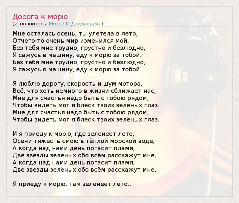 Мне осталась осень, ты улетела в лето, Отчего-то очень мир изменился мой, Без тебя мне трудно, грустно и безлюдно, Я сажусь в машину, еду к морю за тобой. Без тебя мне трудно, грустно и безлюдно, Я сажусь в машину, еду к морю за тобой. Я люблю дорогу, скорость и шум мотора, Всё, что хоть немного в жизни сближает нас, Мне для счастья надо быть с тобою рядом, Чтобы видеть мог я блеск твоих зелёных глаз. Мне для счастья надо быть с тобою рядом, Чтобы видеть мог я блеск твоих зелёных глаз. И я приеду к морю, где зеленеет лето, Осени тяжесть смою в тёплой морской воде, А когда над нами день погасит пламя, Две звезды зелёных обо всём расскажут мне, А когда над нами день погасит пламя, Две звезды зелёных обо всём расскажут мне. Я приеду к морю, там зеленеет лето...