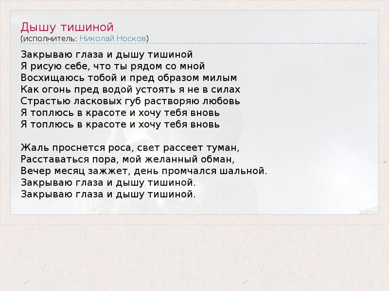 Закрываю глаза и дышу тишиной Я рисую себе, что ты рядом со мной Восхищаюсь тобой и пред образом милым Как огонь пред водой устоять я не в силах Страстью ласковых губ растворяю любовь Я топлюсь в красоте и хочу тебя вновь Я топлюсь в красоте и хочу тебя вновь Жаль проснется роса, свет рассеет туман, Расставаться пора, мой желанный обман, Вечер месяц зажжет, день промчался шальной. Закрываю глаза и дышу тишиной. Закрываю глаза и дышу тишиной.