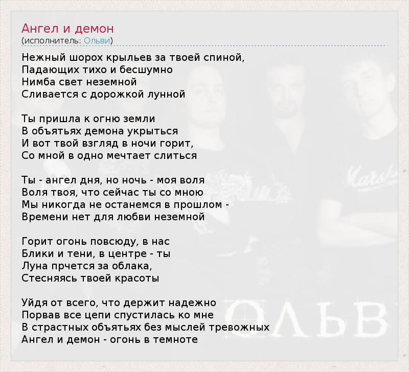Ольви - Ангел и демон http://megalyrics.ru/lyric/%D0%BE%D0%BB%D1%8C%D0%B2%D0%B8/%D0%B0%D0%BD%D0%B3%D0%B5%D0%BB-%D0%B8-%D0%B4%D0%B5%D0%BC%D0%BE%D0%BD.htm#ixzz24C9Q62nq