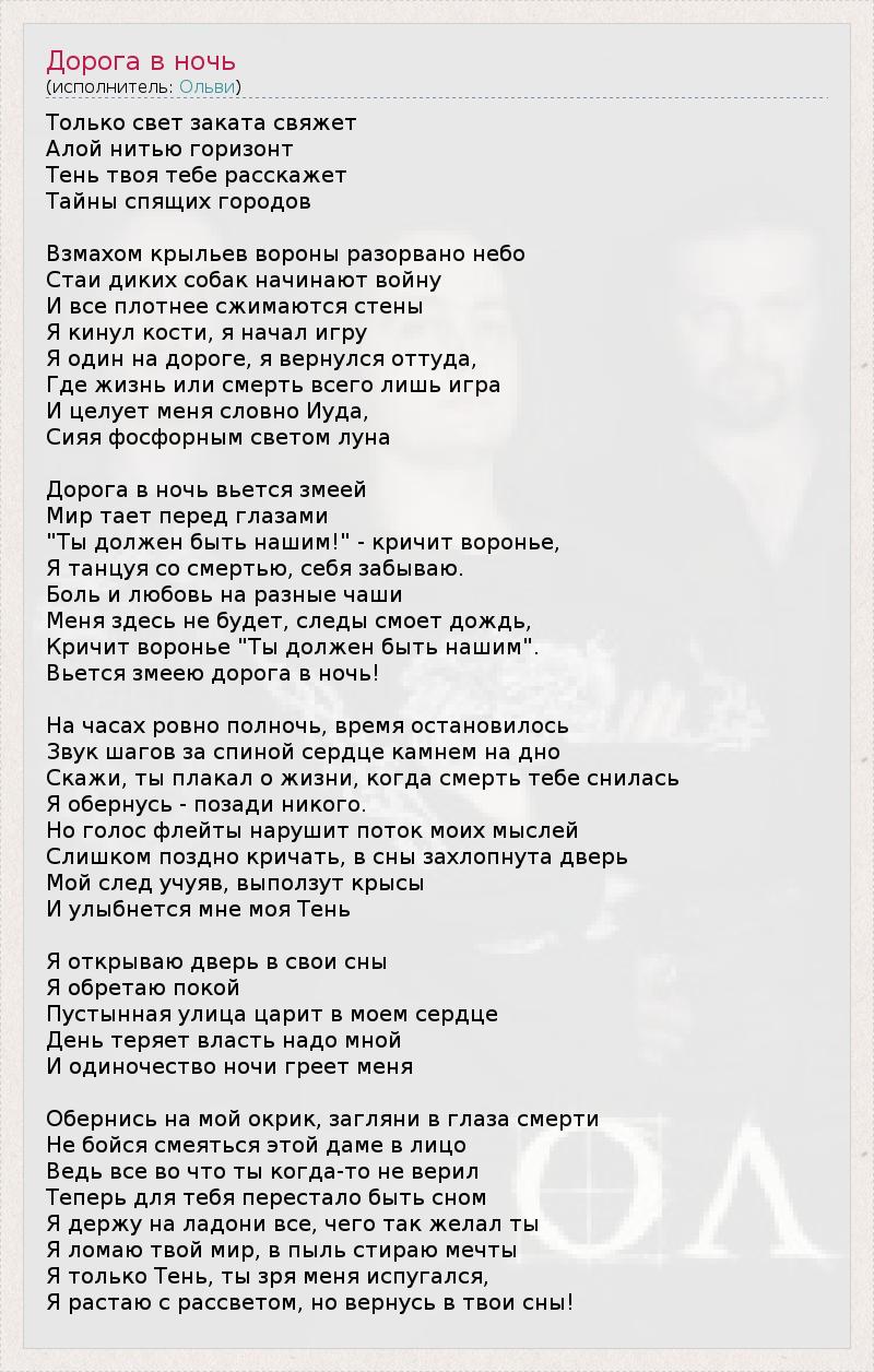 Только свет заката свяжет Алой нитью горизонт Тень твоя тебе расскажет Тайны спящих городов Взмахом крыльев вороны разорвано небо Стаи диких собак начинают войну И все плотнее сжимаются стены Я кинул кости, я начал игру Я один на дороге, я вернулся оттуда, Где жизнь или смерть всего лишь игра И целует меня словно Иуда, Сияя фосфорным светом луна Дорога в ночь вьется змеей Мир тает перед глазами "Ты должен быть нашим!" - кричит воронье, Я танцуя со смертью, себя забываю. Боль и любовь на разные чаши Меня здесь не будет, следы смоет дождь, Кричит воронье "Ты должен быть нашим". Вьется змеею дорога в ночь! На часах ровно полночь, время остановилось Звук шагов за спиной сердце камнем на дно Скажи, ты плакал о жизни, когда смерть тебе снилась Я обернусь - позади никого. Но голос флейты нарушит поток моих мыслей Слишком поздно кричать, в сны захлопнута дверь Мой след учуяв, выползут крысы И улыбнется мне моя Тень Я открываю дверь в свои сны Я обретаю покой Пустынная улица царит в моем сердце День теряет власть надо мной И одиночество ночи греет меня Обернись на мой окрик, загляни в глаза смерти Не бойся смеяться этой даме в лицо Ведь все во что ты когда-то не верил Теперь для тебя перестало быть сном Я держу на ладони все, чего так желал ты Я ломаю твой мир, в пыль стираю мечты Я только Тень, ты зря меня испугался, Я растаю с рассветом, но вернусь в твои сны! Ольви - Дорога в ночь http://megalyrics.ru/lyric/%D0%BE%D0%BB%D1%8C%D0%B2%D0%B8/%D0%B4%D0%BE%D1%80%D0%BE%D0%B3%D0%B0-%D0%B2-%D0%BD%D0%BE%D1%87%D1%8C.htm#ixzz24C9gZrOl