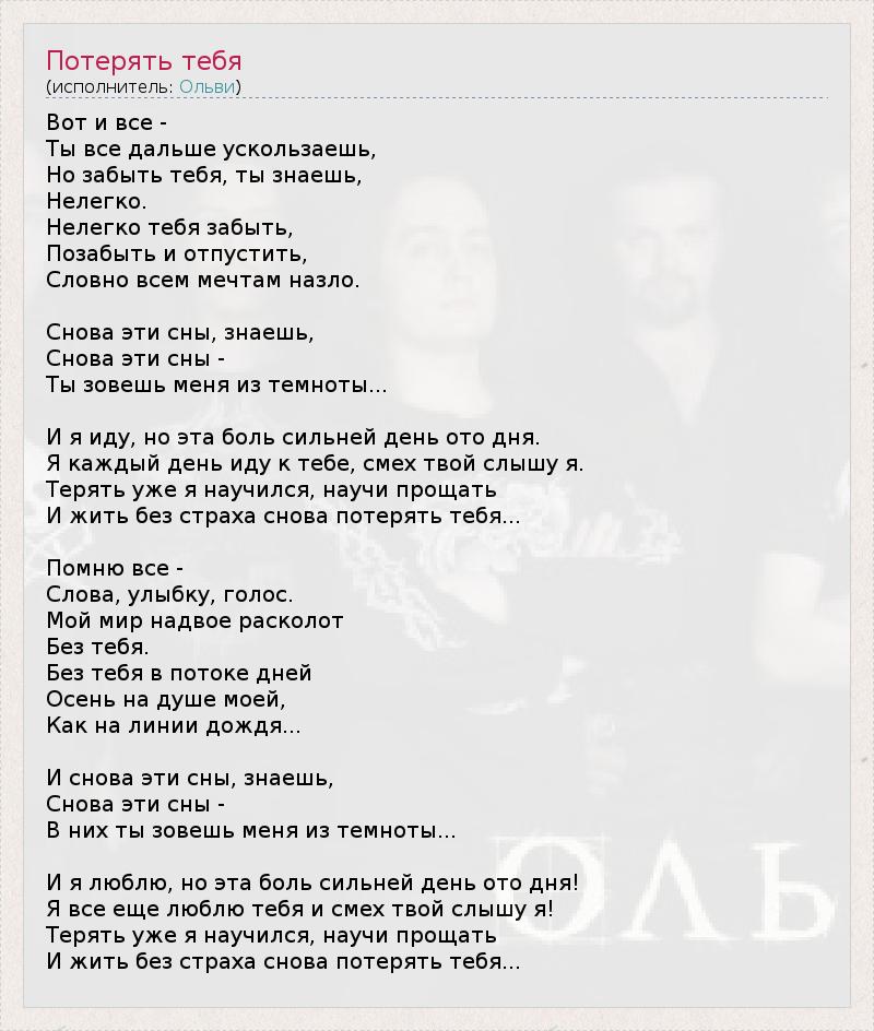 Ольви - Потерять Тебя http://megalyrics.ru/lyric/%D0%BE%D0%BB%D1%8C%D0%B2%D0%B8/%D0%BF%D0%BE%D1%82%D0%B5%D1%80%D1%8F%D1%82%D1%8C-%D1%82%D0%B5%D0%B1%D1%8F.htm#ixzz24C9VHDCf