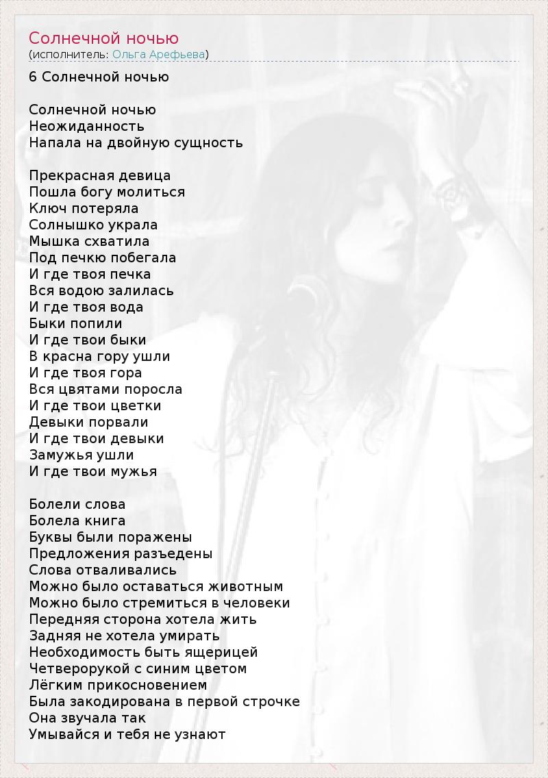 6 solar night Solar night Surprise He attacked the dual nature Beautiful girl I went to pray to God The key is lost Sun stole The mouse caught Under the stove run And where is your oven All water burst Where is your water Bulls had a drink And where are your bulls The Red Mountain gone And where is your mountain All overgrown tsvyatami And where are your flowers Devyki broken And where are your devyki Married left And where are your husbands Ill word Ill book The letters were amazed Offers corroded Words fall off It could be an animal One would seek in a man Front side wanted to live Rear not want to die The need to be a lizard Quadrumana with blue Light touch It was encoded in the first line She sounded so Wash and you do not know