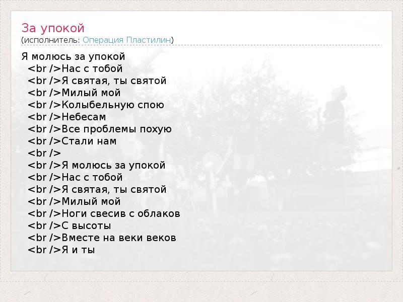 Это интересно:Непризнанные артисты планеты Земля творческая формация «Операция Пластилин».Часть первая. Поэтика. Когда наши первые 2 песни появилась на свет за грязными окнами каморки, где проходила Операция, стоял ноябрь 2002 года. Часть вторая. Начало. Через два дня после родов выступили в ДК «Спутник» (г.Тамбов) на каком-то сейшене в абсолютно адекватном состоянии (!). Так вполне... продолжение