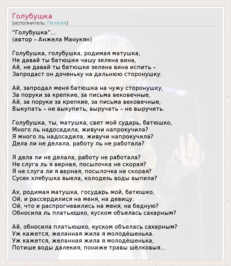 "Голубушка"... (автор – Анжела Манукян) Голубушка, голубушка, родимая матушка, Не давай ты батюшке чашу зелена вина, Ай, не давай ты батюшке зелена вина испить – Запродаст он доченьку на дальнюю сторонушку. Ай, запродал меня батюшка на чужу сторонушку, За поруки за крепкие, за письма вековечные, Ай, за поруки за крепкие, за письма вековечные, Выкупать – не выкупить, выручать – не выручить. Голубушка, ты, матушка, свет мой сударь, батюшко, Много ль надосадила, живучи напрокучила? Я много ль надосадила, живучи напрокучила? Дела ли не делала, работу ль не работала? Я дела ли не делала, работу не работала? Не слуга ль я верная, посылочка не скорая? Я не слуга ли я верная, посылочка не скорая? Сусек хлебушка выела, колодезь воды выпила? Ах, родимая матушка, государь мой, батюшко, Ой, и рассердилися на меня, на девицу. Ой, что и распрогневились на меня, на бедную? Обносила ль платьюшко, куском объелась сахарным? Ай, обносила платьюшко, куском объелась сахарным? Уж кажется, желанная жила я молодёшенька. Уж кажется, желанная жила я молодёшенька, Потише воды далекия, пониже травы шёлковыя...