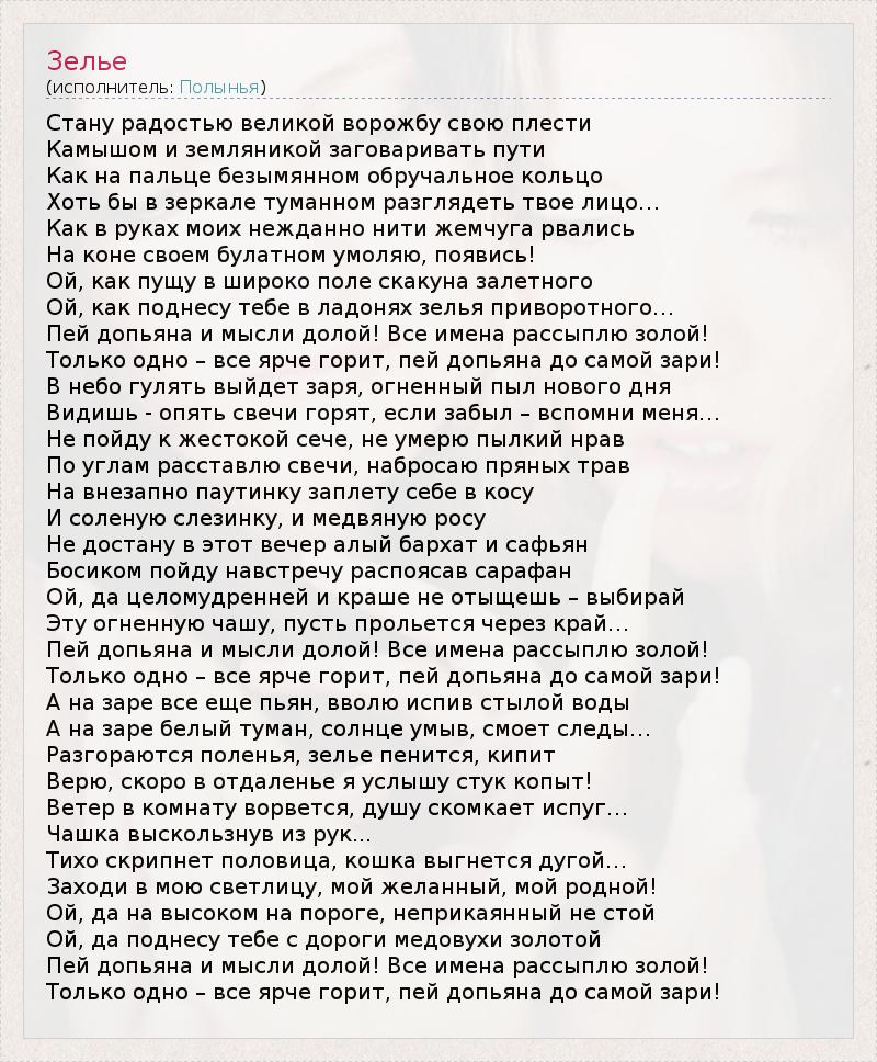 Стану радостью великой ворожбу свою плести Камышом и земляникой заговаривать пути Как на пальце безымянном обручальное кольцо Хоть бы в зеркале туманном разглядеть твое лицо… Как в руках моих нежданно нити жемчуга рвались На коне своем булатном умоляю, появись! Ой, как пущу в широко поле скакуна залетного Ой, как поднесу тебе в ладонях зелья приворотного… Пей допьяна и мысли долой! Все имена рассыплю золой! Только одно – все ярче горит, пей допьяна до самой зари! В небо гулять выйдет заря, огненный пыл нового дня Видишь - опять свечи горят, если забыл – вспомни меня… Не пойду к жестокой сече, не умерю пылкий нрав По углам расставлю свечи, набросаю пряных трав На внезапно паутинку заплету себе в косу И соленую слезинку, и медвяную росу Не достану в этот вечер алый бархат и сафьян Босиком пойду навстречу распоясав сарафан Ой, да целомудренней и краше не отыщешь – выбирай Эту огненную чашу, пусть прольется через край… Пей допьяна и мысли долой! Все имена рассыплю золой! Только одно – все ярче горит, пей допьяна до самой зари! А на заре все еще пьян, вволю испив стылой воды А на заре белый туман, солнце умыв, смоет следы… Разгораются поленья, зелье пенится, кипит Верю, скоро в отдаленье я услышу стук копыт! Ветер в комнату ворвется, душу скомкает испуг… Чашка выскользнув из рук... Тихо скрипнет половица, кошка выгнется дугой… Заходи в мою светлицу, мой желанный, мой родной! Ой, да на высоком на пороге, неприкаянный не стой Ой, да поднесу тебе с дороги медовухи золотой Пей допьяна и мысли долой! Все имена рассыплю золой! Только одно – все ярче горит, пей допьяна до самой зари!