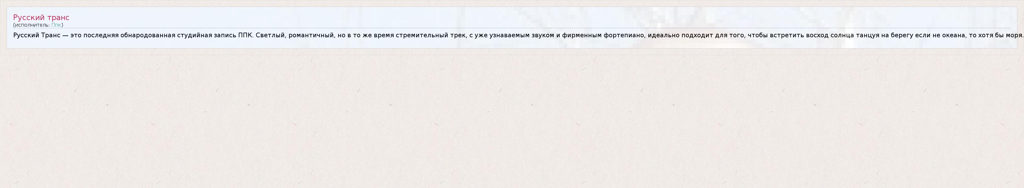 Русский Транс — это последняя обнародованная студийная запись ППК. Светлый, романтичный, но в то же время стремительный трек, с уже узнаваемым звуком и фирменным фортепиано, идеально подходит для того, чтобы встретить восход солнца танцуя на берегу если не океана, то хотя бы моря.