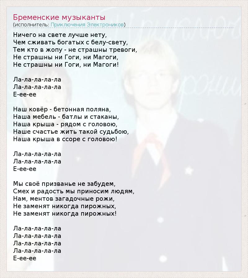 Ничего на свете лучше нету, Чем сживать богатых с белу-свету, Тем кто в жопу - не страшны тревоги, Не страшны ни Гоги, ни Магоги, Не страшны ни Гоги, ни Магоги! Ла-ла-ла-ла-ла Ла-ла-ла-ла-ла Е-ее-ее Наш ковёр - бетонная поляна, Наша мебель - батлы и стаканы, Наша крыша - рядом с головою, Наше счастье жить такой судьбою, Наша крыша в ссоре с головою! Ла-ла-ла-ла-ла Ла-ла-ла-ла-ла Е-ее-ее Мы своё призванье не забудем, Смех и радость мы приносим людям, Нам, ментов загадочные рожи, Не заменят никогда пирожных, Не заменят никогда пирожных! Ла-ла-ла-ла-ла Ла-ла-ла-ла-ла Ла-ла-ла-ла-ла Ла-ла-ла-ла-ла Е-ее-ее