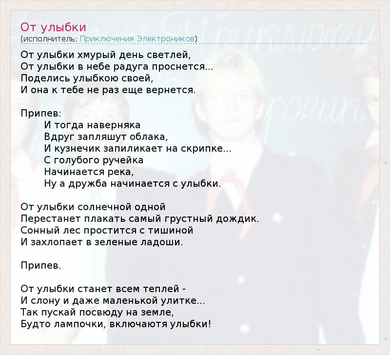 Это интересно:Приключения Электроников — российская панк-группа. «Приключения Электроников» не исполняют собственных песен — исключительно кавер-версии песен из советских детских фильмов, мультфильмов и просто хиты тех лет (преимущественно 60-х годов).ИсторияИнициатором появления этого проекта являлся Константин Савельевских (... продолжение