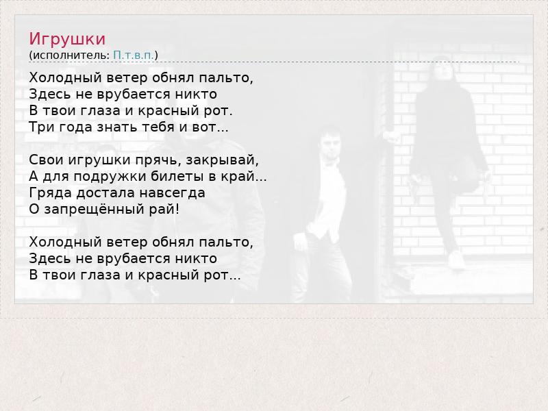 Это интересно:После́дние Та́нки В Пари́же (П. Т. В. П.) — панк-группа из Выборга, Ленинградская область, Россия. Коллектив был основан в 1996 году Алексеем Никоновым, чаще упоминаемым как Лёха Никонов.Первоначально группа была названа «Последнее танго в Париже» по одноимённому фильму (режиссёр: Бернардо Бертолуччи), позже Эдуард «Рэдт» Старков, записывая группу на выступление в клубе «TaMtAm», предложил... продолжение