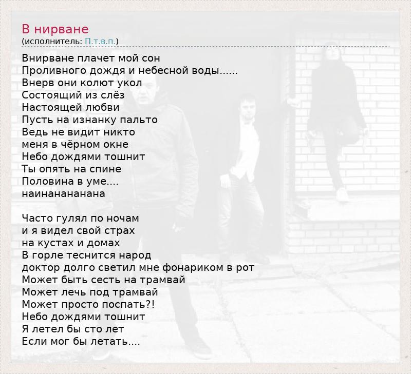 Внирване плачет мой сон Проливного дождя и небесной воды...... Внерв они колют укол Состоящий из слёз Настоящей любви Пусть на изнанку пальто Ведь не видит никто меня в чёрном окне Небо дождями тошнит Ты опять на спине Половина в уме.... наинанананана Часто гулял по ночам и я видел свой страх на кустах и домах В горле теснится народ доктор долго светил мне фонариком в рот Может быть сесть на трамвай Может лечь под трамвай Может просто поспать?! Небо дождями тошнит Я летел бы сто лет Если мог бы летать....