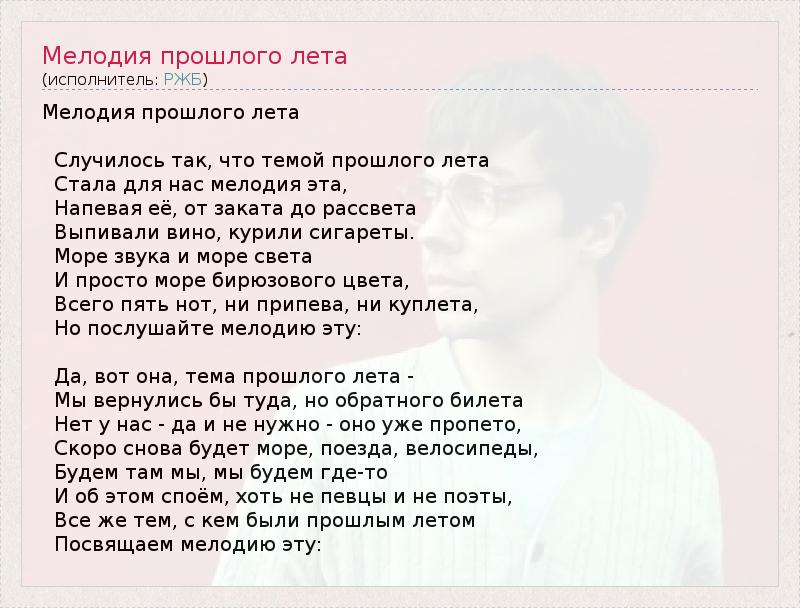ГлавнаяИсполнителиРЖБМелодия прошлого лета