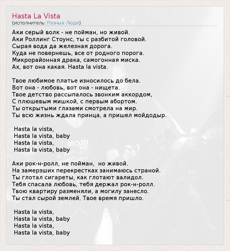 Аки серый волк - не пойман, но живой. Аки Роллинг Стоунс, ты с разбитой головой. Сырая вода да железная дорога. Куда не повернешь, все от родного порога. Микрорайонная драка, самогонная миска. Ах, вот она какая. Hasta la vista. Твое любимое платье износилось до бела. Вот она - любовь, вот она - нищета. Твое детство рассыпалось звонким аккордом, С плюшевым мишкой, с первым абортом. Ты открытыми глазами смотрела на мир. Ты всю жизнь ждала принца, а пришел мойдодыр. Hasta la vista, Hasta la vista, babу Hasta la vista, Hasta la vista, babу Аки рок-н-ролл, не пойман, но живой. На замерзших перекрестках занимаюсь страной. Ты глотал сигареты, как глотают валидол. Тебя спасала любовь, тебя держал рок-н-ролл. Твою квартиру разменяли, а могилу занесло. Ты стал сырой землей. Твое время пришло. Hasta la vista, Hasta la vista, babу Hasta la vista, Hasta la vista, babу