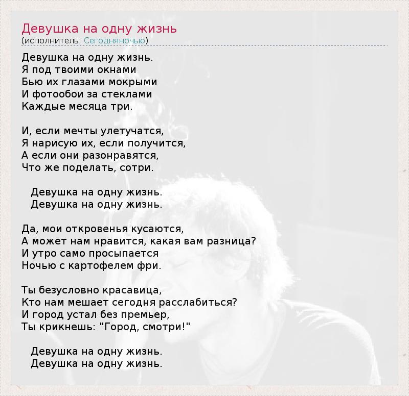 Девушка на одну жизнь. Я под твоими окнами Бью их глазами мокрыми И фотообои за стеклами Каждые месяца три. И, если мечты улетучатся, Я нарисую их, если получится, А если они разонравятся, Что же поделать, сотри. Девушка на одну жизнь. Девушка на одну жизнь. Да, мои откровенья кусаются, А может нам нравится, какая вам разница? И утро само просыпается Ночью с картофелем фри. Ты безусловно красавица, Кто нам мешает сегодня расслабиться? И город устал без премьер, Ты крикнешь: "Город, смотри!" Девушка на одну жизнь. Девушка на одну жизнь.