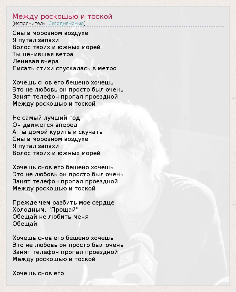 Сны в морозном воздухе Я путал запахи Волос твоих и южных морей Ты ценившая ветра Ленивая вчера Писать стихи спускалась в метро Хочешь снов его бешено хочешь Это не любовь он просто был очень Занят телефон пропал проездной Между роскошью и тоской Не самый лучший год Он движется вперед А ты домой курить и скучать Сны в морозном воздухе Я путал запахи Волос твоих и южных морей Хочешь снов его бешено хочешь Это не любовь он просто был очень Занят телефон пропал проездной Между роскошью и тоской Прежде чем разбить мое сердце Холодным, "Прощай" Обещай не любить меня Обещай Хочешь снов его бешено хочешь Это не любовь он просто был очень Занят телефон пропал проездной Между роскошью и тоской Хочешь снов его