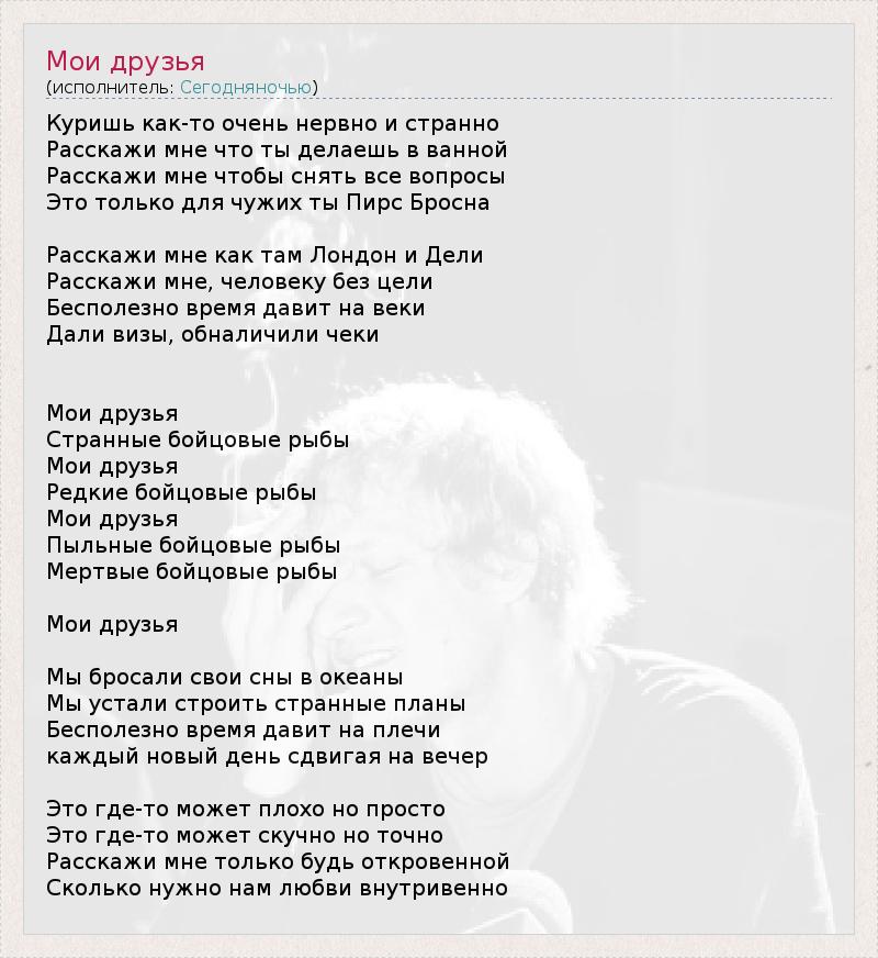 Куришь как-то очень нервно и странно Расскажи мне что ты делаешь в ванной Расскажи мне чтобы снять все вопросы Это только для чужих ты Пирс Бросна Расскажи мне как там Лондон и Дели Расскажи мне, человеку без цели Бесполезно время давит на веки Дали визы, обналичили чеки Мои друзья Странные бойцовые рыбы Мои друзья Редкие бойцовые рыбы Мои друзья Пыльные бойцовые рыбы Мертвые бойцовые рыбы Мои друзья Мы бросали свои сны в океаны Мы устали строить странные планы Бесполезно время давит на плечи каждый новый день сдвигая на вечер Это где-то может плохо но просто Это где-то может скучно но точно Расскажи мне только будь откровенной Сколько нужно нам любви внутривенно