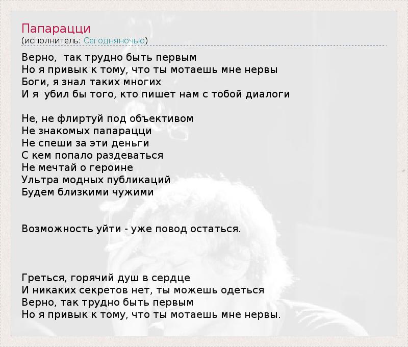 Верно, так трудно быть первым Но я привык к тому, что ты мотаешь мне нервы Боги, я знал таких многих И я убил бы того, кто пишет нам с тобой диалоги Не, не флиртуй под объективом Не знакомых папарацци Не спеши за эти деньги С кем попало раздеваться Не мечтай о героине Ультра модных публикаций Будем близкими чужими Возможность уйти - уже повод остаться. Греться, горячий душ в сердце И никаких секретов нет, ты можешь одеться Верно, так трудно быть первым Но я привык к тому, что ты мотаешь мне нервы.