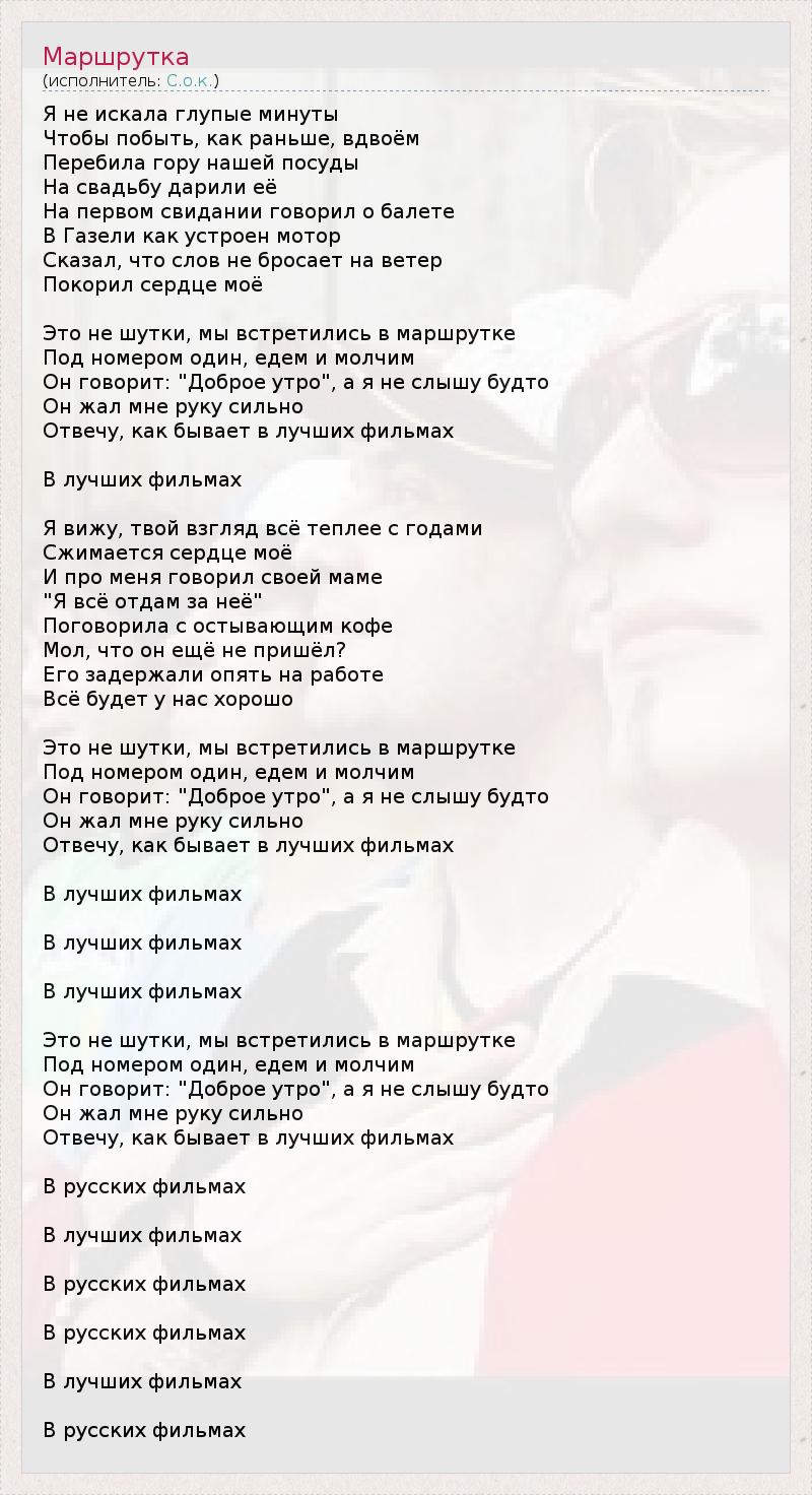 Я не искала глупые минуты Чтобы побыть, как раньше, вдвоём Перебила гору нашей посуды На свадьбу дарили её На первом свидании говорил о балете В Газели как устроен мотор Сказал, что слов не бросает на ветер Покорил сердце моё Это не шутки, мы встретились в маршрутке Под номером один, едем и молчим Он говорит: "Доброе утро", а я не слышу будто Он жал мне руку сильно Отвечу, как бывает в лучших фильмах В лучших фильмах Я вижу, твой взгляд всё теплее с годами Сжимается сердце моё И про меня говорил своей маме "Я всё отдам за неё" Поговорила с остывающим кофе Мол, что он ещё не пришёл? Его задержали опять на работе Всё будет у нас хорошо Это не шутки, мы встретились в маршрутке Под номером один, едем и молчим Он говорит: "Доброе утро", а я не слышу будто Он жал мне руку сильно Отвечу, как бывает в лучших фильмах В лучших фильмах В лучших фильмах В лучших фильмах Это не шутки, мы встретились в маршрутке Под номером один, едем и молчим Он говорит: "Доброе утро", а я не слышу будто Он жал мне руку сильно Отвечу, как бывает в лучших фильмах В русских фильмах В лучших фильмах В русских фильмах В русских фильмах В лучших фильмах В русских фильмах