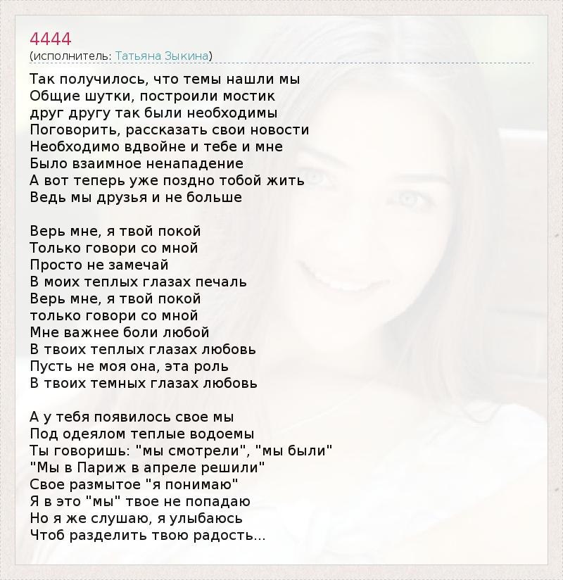 Это интересно:Татьяна Зыкина родилась в Ижевске 20 апреля 1981 году. Работала журналистом, теле- и радио-ведущей. Песни начала сочинять в... продолжение