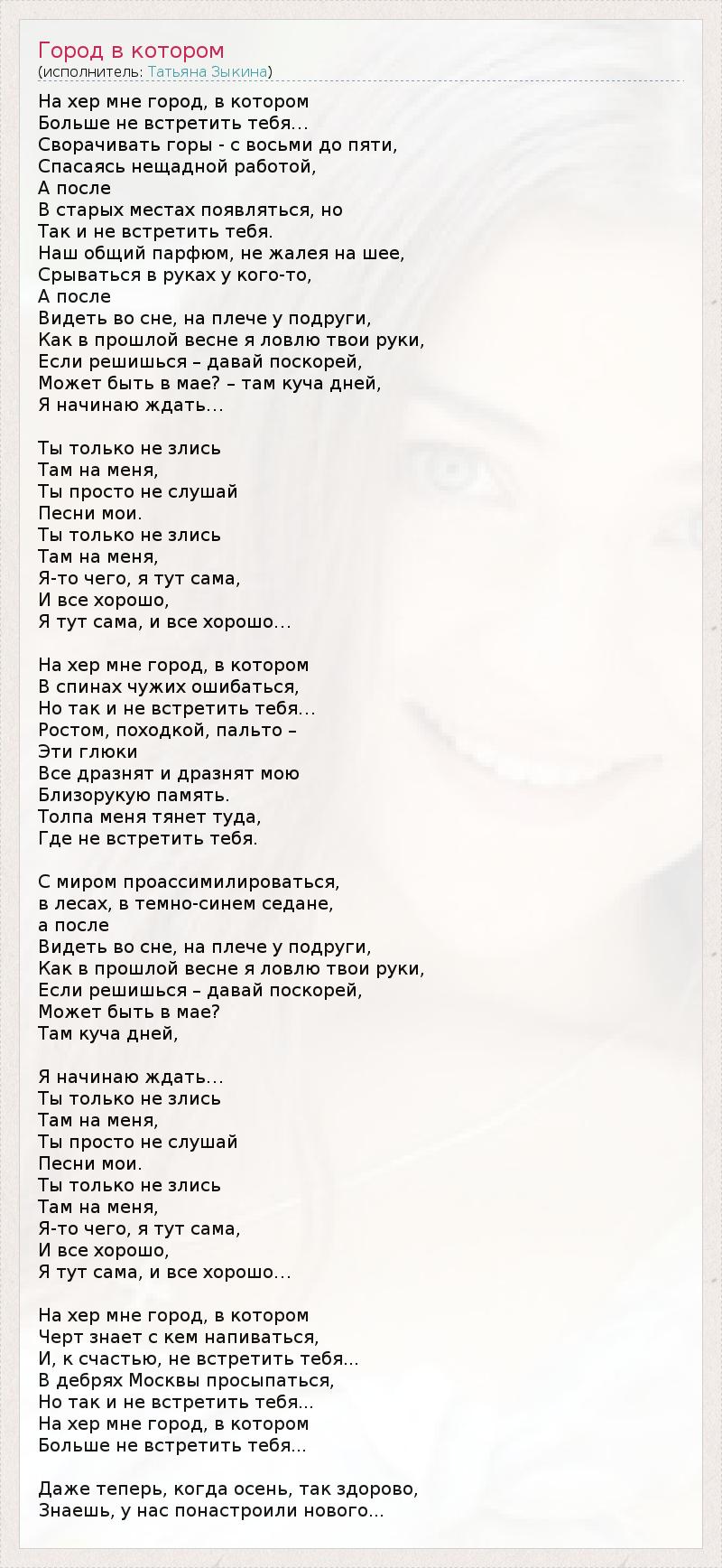 На хер мне город, в котором Больше не встретить тебя… Сворачивать горы - с восьми до пяти, Спасаясь нещадной работой, А после В старых местах появляться, но Так и не встретить тебя. Наш общий парфюм, не жалея на шее, Срываться в руках у кого-то, А после Видеть во сне, на плече у подруги, Как в прошлой весне я ловлю твои руки, Если решишься – давай поскорей, Может быть в мае? – там куча дней, Я начинаю ждать… Ты только не злись Там на меня, Ты просто не слушай Песни мои. Ты только не злись Там на меня, Я-то чего, я тут сама, И все хорошо, Я тут сама, и все хорошо… На хер мне город, в котором В спинах чужих ошибаться, Но так и не встретить тебя… Ростом, походкой, пальто – Эти глюки Все дразнят и дразнят мою Близорукую память. Толпа меня тянет туда, Где не встретить тебя. С миром проассимилироваться, в лесах, в темно-синем седане, а после Видеть во сне, на плече у подруги, Как в прошлой весне я ловлю твои руки, Если решишься – давай поскорей, Может быть в мае? Там куча дней, Я начинаю ждать… Ты только не злись Там на меня, Ты просто не слушай Песни мои. Ты только не злись Там на меня, Я-то чего, я тут сама, И все хорошо, Я тут сама, и все хорошо… На хер мне город, в котором Черт знает с кем напиваться, И, к счастью, не встретить тебя... В дебрях Москвы просыпаться, Но так и не встретить тебя... На хер мне город, в котором Больше не встретить тебя... Даже теперь, когда осень, так здорово, Знаешь, у нас понастроили нового...