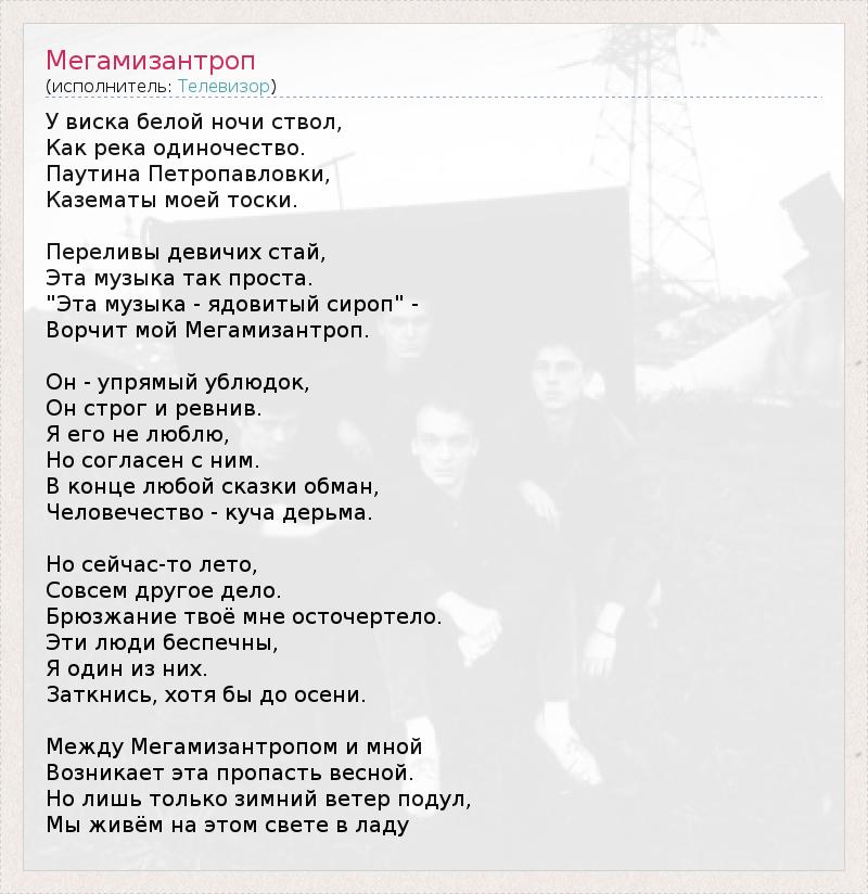 У виска белой ночи ствол, Как река одиночество. Паутина Петропавловки, Казематы моей тоски. Переливы девичих стай, Эта музыка так проста. "Эта музыка - ядовитый сироп" - Ворчит мой Мегамизантроп. Он - упрямый ублюдок, Он строг и ревнив. Я его не люблю, Но согласен с ним. В конце любой сказки обман, Человечество - куча дерьма. Но сейчас-то лето, Совсем другое дело. Брюзжание твоё мне осточертело. Эти люди беспечны, Я один из них. Заткнись, хотя бы до осени. Между Мегамизантропом и мной Возникает эта пропасть весной. Но лишь только зимний ветер подул, Мы живём на этом свете в ладу