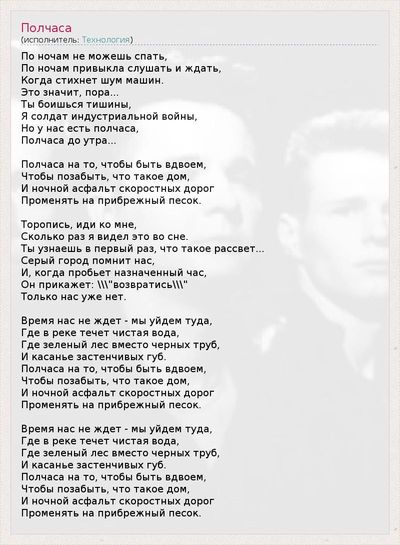 По ночам не можешь спать, По ночам привыкла слушать и ждать, Когда стихнет шум машин. Это значит, пора... Ты боишься тишины, Я солдат индустриальной войны, Но у нас есть полчаса, Полчаса до утра... Полчаса на то, чтобы быть вдвоем, Чтобы позабыть, что такое дом, И ночной асфальт скоростных дорог Променять на прибрежный песок. Торопись, иди ко мне, Сколько раз я видел это во сне. Ты узнаешь в первый раз, что такое рассвет... Серый город помнит нас, И, когда пробьет назначенный час, Он прикажет: \\\"возвратись\\\" Только нас уже нет. Время нас не ждет - мы уйдем туда, Где в реке течет чистая вода, Где зеленый лес вместо черных труб, И касанье застенчивых губ. Полчаса на то, чтобы быть вдвоем, Чтобы позабыть, что такое дом, И ночной асфальт скоростных дорог Променять на прибрежный песок. Время нас не ждет - мы уйдем туда, Где в реке течет чистая вода, Где зеленый лес вместо черных труб, И касанье застенчивых губ. Полчаса на то, чтобы быть вдвоем, Чтобы позабыть, что такое дом, И ночной асфальт скоростных дорог Променять на прибрежный песок.