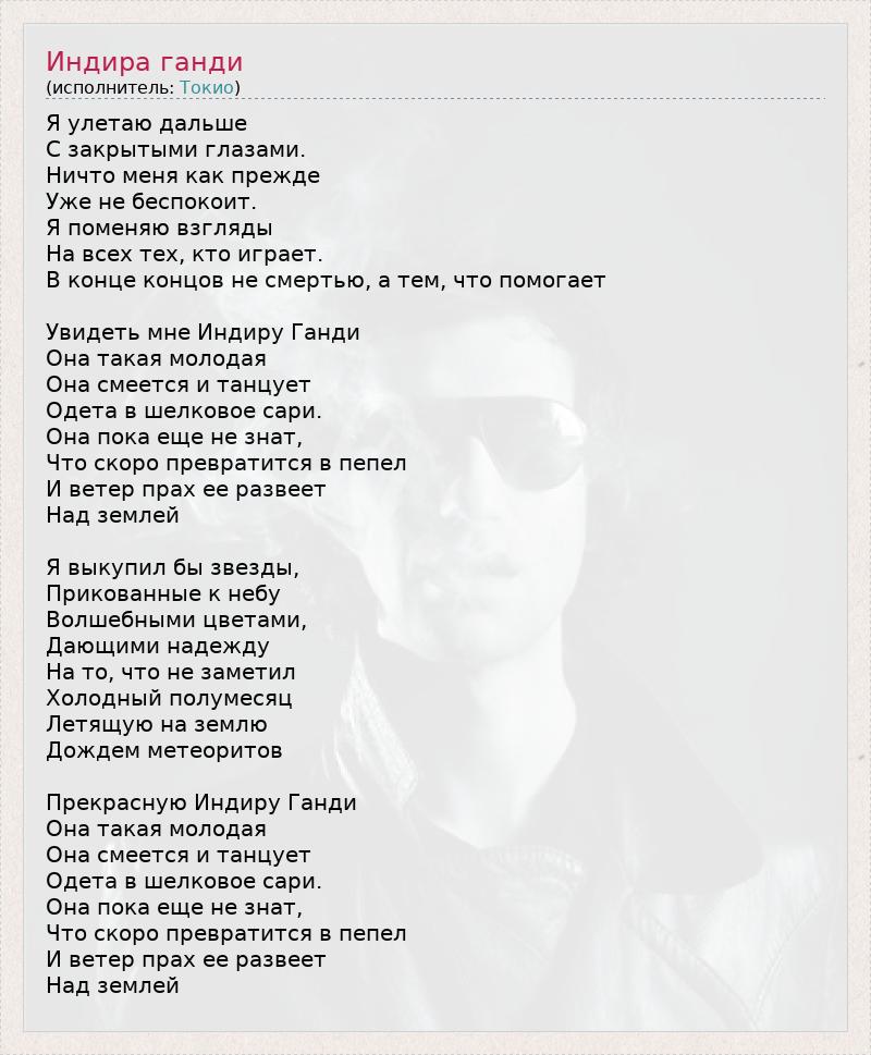 Я улетаю дальше С закрытыми глазами. Ничто меня как прежде Уже не беспокоит. Я поменяю взгляды На всех тех, кто играет. В конце концов не смертью, а тем, что помогает Увидеть мне Индиру Ганди Она такая молодая Она смеется и танцует Одета в шелковое сари. Она пока еще не знат, Что скоро превратится в пепел И ветер прах ее развеет Над землей Я выкупил бы звезды, Прикованные к небу Волшебными цветами, Дающими надежду На то, что не заметил Холодный полумесяц Летящую на землю Дождем метеоритов Прекрасную Индиру Ганди Она такая молодая Она смеется и танцует Одета в шелковое сари. Она пока еще не знат, Что скоро превратится в пепел И ветер прах ее развеет Над землей