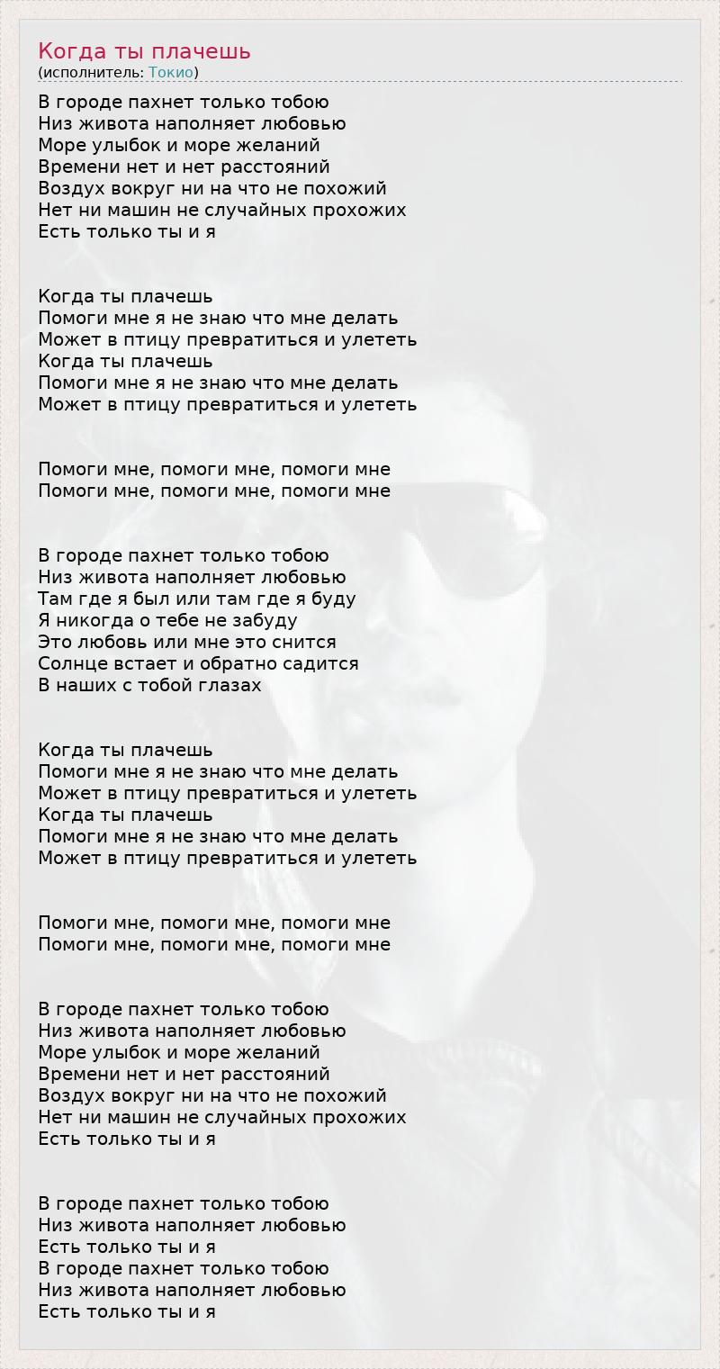 В городе пахнет только тобою Низ живота наполняет любовью Море улыбок и море желаний Времени нет и нет расстояний Воздух вокруг ни на что не похожий Нет ни машин не случайных прохожих Есть только ты и я Когда ты плачешь Помоги мне я не знаю что мне делать Может в птицу превратиться и улететь Когда ты плачешь Помоги мне я не знаю что мне делать Может в птицу превратиться и улететь Помоги мне, помоги мне, помоги мне Помоги мне, помоги мне, помоги мне В городе пахнет только тобою Низ живота наполняет любовью Там где я был или там где я буду Я никогда о тебе не забуду Это любовь или мне это снится Солнце встает и обратно садится В наших с тобой глазах Когда ты плачешь Помоги мне я не знаю что мне делать Может в птицу превратиться и улететь Когда ты плачешь Помоги мне я не знаю что мне делать Может в птицу превратиться и улететь Помоги мне, помоги мне, помоги мне Помоги мне, помоги мне, помоги мне В городе пахнет только тобою Низ живота наполняет любовью Море улыбок и море желаний Времени нет и нет расстояний Воздух вокруг ни на что не похожий Нет ни машин не случайных прохожих Есть только ты и я В городе пахнет только тобою Низ живота наполняет любовью Есть только ты и я В городе пахнет только тобою Низ живота наполняет любовью Есть только ты и я