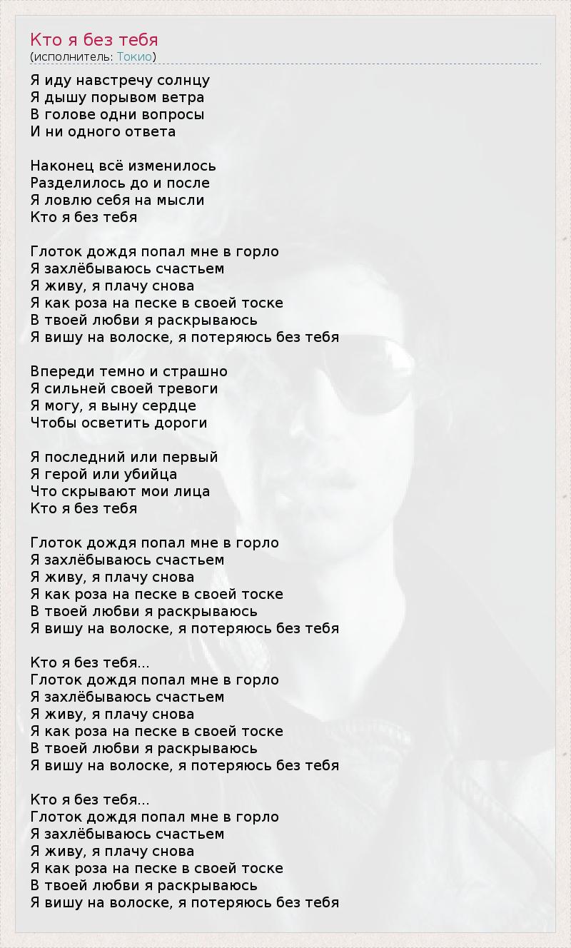 Я иду навстречу солнцу Я дышу порывом ветра В голове одни вопросы И ни одного ответа Наконец всё изменилось Разделилось до и после Я ловлю себя на мысли Кто я без тебя Глоток дождя попал мне в горло Я захлёбываюсь счастьем Я живу, я плачу снова Я как роза на песке в своей тоске В твоей любви я раскрываюсь Я вишу на волоске, я потеряюсь без тебя Впереди темно и страшно Я сильней своей тревоги Я могу, я выну сердце Чтобы осветить дороги Я последний или первый Я герой или убийца Что скрывают мои лица Кто я без тебя Глоток дождя попал мне в горло Я захлёбываюсь счастьем Я живу, я плачу снова Я как роза на песке в своей тоске В твоей любви я раскрываюсь Я вишу на волоске, я потеряюсь без тебя Кто я без тебя... Глоток дождя попал мне в горло Я захлёбываюсь счастьем Я живу, я плачу снова Я как роза на песке в своей тоске В твоей любви я раскрываюсь Я вишу на волоске, я потеряюсь без тебя Кто я без тебя... Глоток дождя попал мне в горло Я захлёбываюсь счастьем Я живу, я плачу снова Я как роза на песке в своей тоске В твоей любви я раскрываюсь Я вишу на волоске, я потеряюсь без тебя