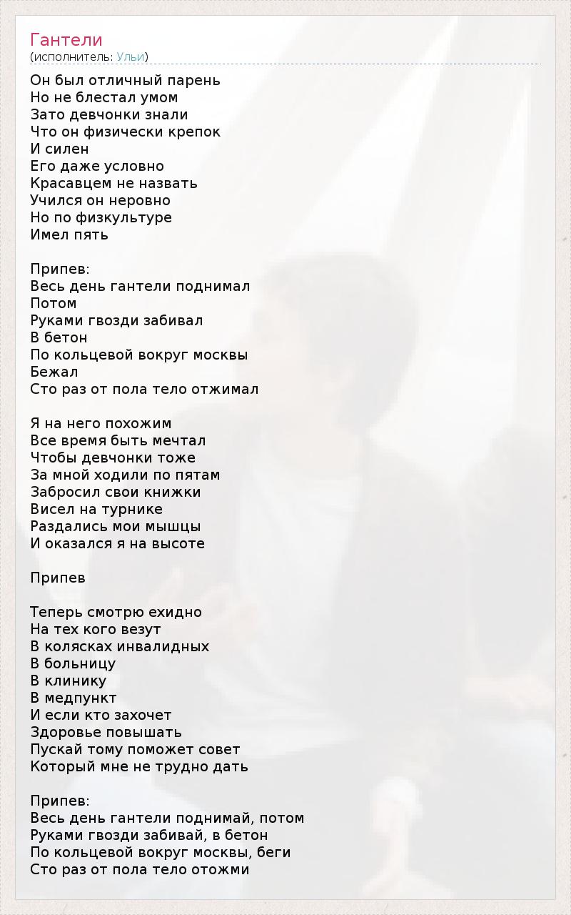 Он был отличный парень Но не блестал умом Зато девчонки знали Что он физически крепок И силен Его даже условно Красавцем не назвать Учился он неровно Но по физкультуре Имел пять Припев: Весь день гантели поднимал Потом Руками гвозди забивал В бетон По кольцевой вокруг москвы Бежал Сто раз от пола тело отжимал Я на него похожим Все время быть мечтал Чтобы девчонки тоже За мной ходили по пятам Забросил свои книжки Висел на турнике Раздались мои мышцы И оказался я на высоте Припев Теперь смотрю ехидно На тех кого везут В колясках инвалидных В больницу В клинику В медпункт И если кто захочет Здоровье повышать Пускай тому поможет совет Который мне не трудно дать Припев: Весь день гантели поднимай, потом Руками гвозди забивай, в бетон По кольцевой вокруг москвы, беги Сто раз от пола тело отожми