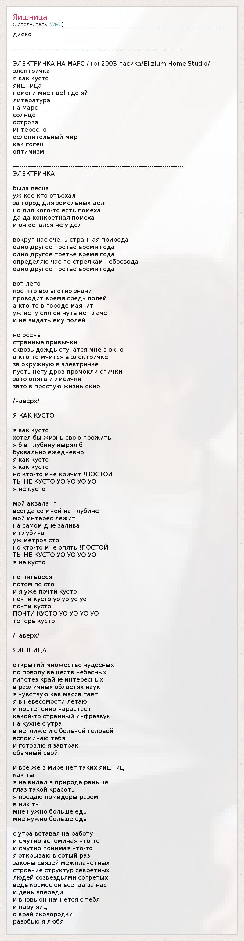 диско -------------------------------------------------------------------------------- ЭЛЕКТРИЧКА НА МАРС / (p) 2003 пасика/Elizium Home Studio/ электричка я как кусто яишница помоги мне где! где я? литература на марс солнце острова интересно ослепительный мир как гоген оптимизм -------------------------------------------------------------------------------- ЭЛЕКТРИЧКА была весна уж кое-кто отъехал за город для земельных дел но для кого-то есть помеха да да конкретная помеха и он остался не у дел вокруг нас очень странная природа одно другое третье время года одно другое третье время года определяю час по стрелкам небосвода одно другое третье время года вот лето кое-кто вольготно значит проводит время средь полей а кто-то в городе маячит уж нету сил он чуть не плачет и не видать ему полей но осень странные привычки сквозь дождь стучатся мне в окно а кто-то мчится в электричке за окружную в электричке пусть нету дров промокли спички зато опята и лисички зато в простую жизнь окно /наверх/ Я КАК КУСТО я как кусто хотел бы жизнь свою прожить я б в глубину нырял б буквально ежедневно я как кусто я как кусто но кто-то мне кричит !ПОСТОЙ ТЫ НЕ КУСТО УО УО УО УО я не кусто мой акваланг всегда со мной на глубине мой интерес лежит на самом дне залива и глубина уж метров сто но кто-то мне опять !ПОСТОЙ ТЫ НЕ КУСТО УО УО УО УО я не кусто по пятьдесят потом по сто и я уже почти кусто почти кусто уо уо уо уо почти кусто ПОЧТИ КУСТО УО УО УО УО теперь кусто /наверх/ ЯИШНИЦА открытий множество чудесных по поводу веществ небесных гипотез крайне интересных в различных областях наук я чувствую как масса тает я в невесомости летаю и постепенно нарастает какой-то странный инфразвук на кухне с утра в неглиже и с больной головой вспоминаю тебя и готовлю я завтрак обычный свой и все же в мире нет таких яишниц как ты я не видал в природе раньше глаз такой красоты я поедаю помидоры разом в них ты мне нужно больше еды мне нужно больше еды с утра вставая на работу и смутно вспоминая что-то и смутно понимая что-то я открываю в сотый раз законы связей межпланетных строение структур секретных людей созвездьями согретых ведь космос он всегда за нас и день впереди и вновь он начнется с тебя и пару яиц о край сковородки разобью я любя