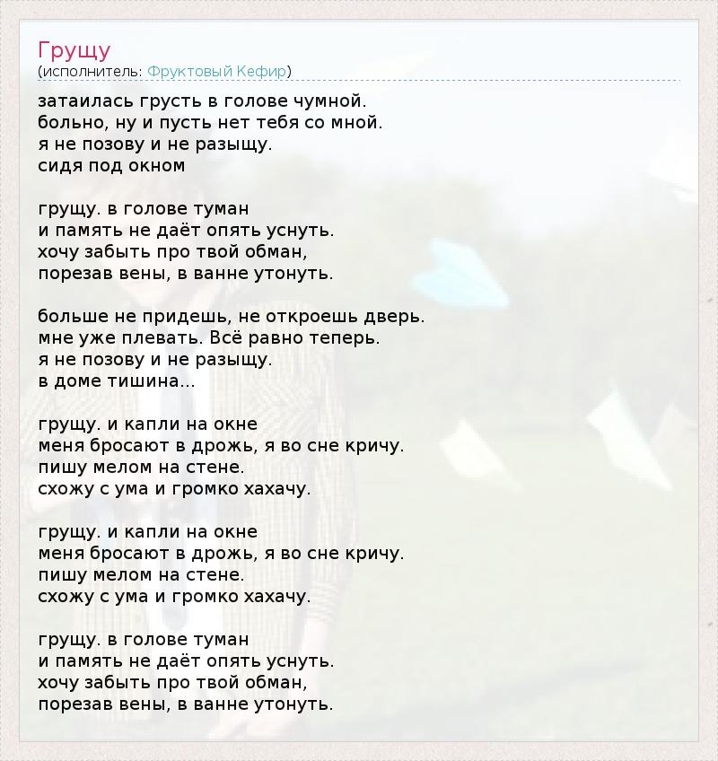 Это интересно:Ф Р У К Т О В Ы Й К Е Ф И Р - вокально-инструментальный коктейль, изготовленный по оригинальным рецептам. Обладает изысканной вкусовой гаммой. Употребив этот напиток, вы поймете, что всё в этом мире относительно. Что выход - это очередной вход, а конец - это только начало;с о с т а в: вокал, гитара, бас, барабаны, саксофон;п и щ е в а я ц е н н о с т ь: фанки-панк, поп-авангард, инди-рок; у п... продолжение
