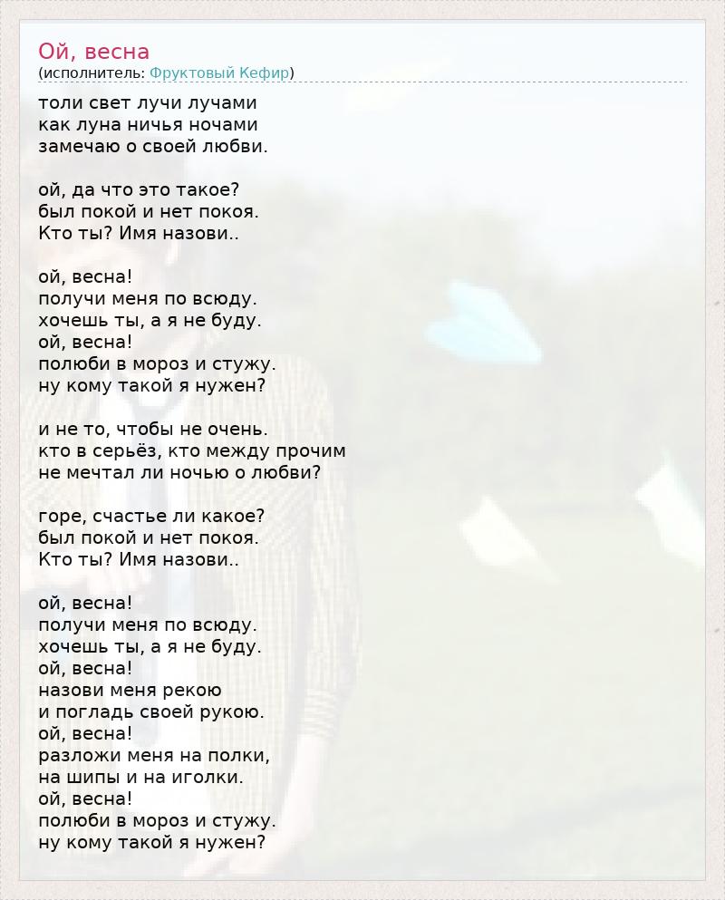 толи свет лучи лучами как луна ничья ночами замечаю о своей любви. ой, да что это такое? был покой и нет покоя. Кто ты? Имя назови.. ой, весна! получи меня по всюду. хочешь ты, а я не буду. ой, весна! полюби в мороз и стужу. ну кому такой я нужен? и не то, чтобы не очень. кто в серьёз, кто между прочим не мечтал ли ночью о любви? горе, счастье ли какое? был покой и нет покоя. Кто ты? Имя назови.. ой, весна! получи меня по всюду. хочешь ты, а я не буду. ой, весна! назови меня рекою и погладь своей рукою. ой, весна! разложи меня на полки, на шипы и на иголки. ой, весна! полюби в мороз и стужу. ну кому такой я нужен?