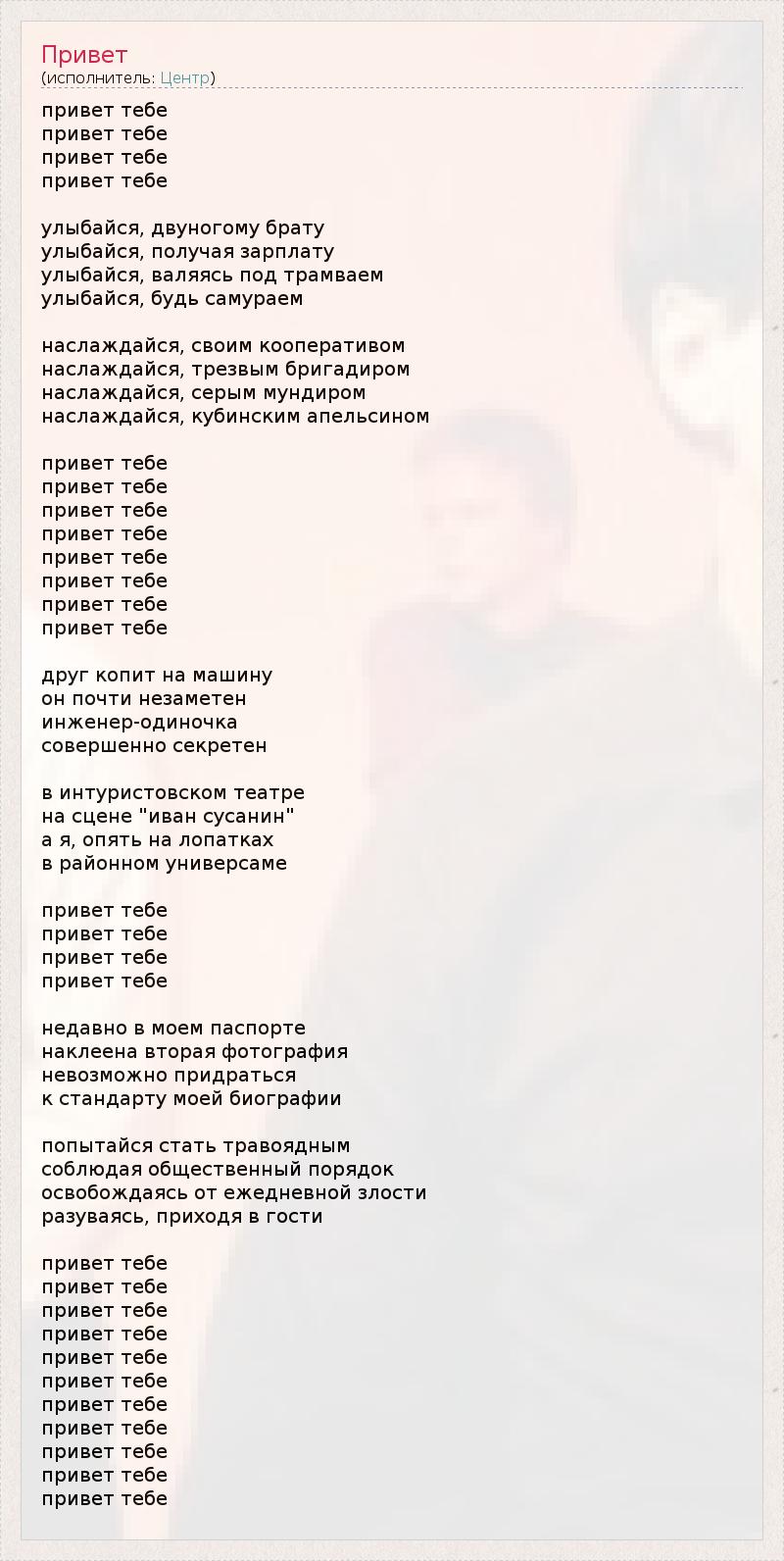 Это интересно:«Центр» — музыкальная группа, образованная в Москве в конце 1970-х годов под названием «777». C 1990 года базируется, помимо Москвы, в Лос-Анджелесе (США). Основатель и лидер группы — Василий Шумов. Стиль группы менялся от новой волны и русского рока до электроники.В начале 1980-х группа «Центр» стала известной в советском андерграунде того времени. Сформировался классический состав... продолжение