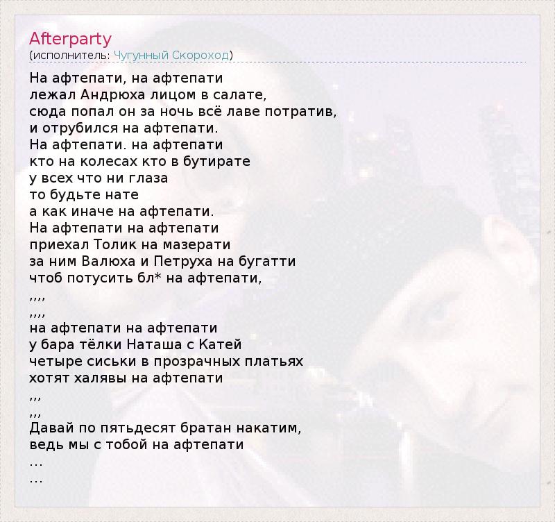 На афтепати, на афтепати лежал Андрюха лицом в салате, сюда попал он за ночь всё лаве потратив, и отрубился на афтепати. На афтепати. на афтепати кто на колесах кто в бутирате у всех что ни глаза то будьте нате а как иначе на афтепати. На афтепати на афтепати приехал Толик на мазерати за ним Валюха и Петруха на бугатти чтоб потусить бл* на афтепати, ,,,, ,,,, на афтепати на афтепати у бара тёлки Наташа с Катей четыре сиськи в прозрачных платьях хотят халявы на афтепати ,,, ,,, Давай по пятьдесят братан накатим, ведь мы с тобой на афтепати … …