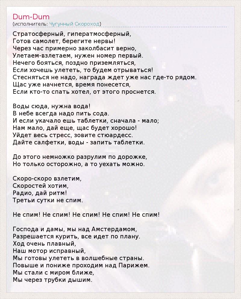 Стратосферный, гиператмосферный, Готов самолет, берегите нервы! Через час примерно заколбасит верно, Улетаем-взлетаем, нужен номер первый. Нечего бояться, поздно приземляться, Если хочешь улететь, то будем отрываться! Стесняться не надо, награда ждет уже нас где-то рядом. Щас уже начнется, время понесется, Если кто-то спать хотел, от этого проснется. Воды сюда, нужна вода! В небе всегда надо пить сода. И если укачало ешь таблетки, сначала - мало; Нам мало, дай еще, щас будет хорошо! Уйдет весь стресс, зовите стюардесс. Дайте салфетки, воды - запить таблетки. До этого немножко разрулим по дорожке, Но только осторожно, а то уехать можно. Скоро-скоро взлетим, Скоростей хотим, Радио, дай ритм! Третьи сутки не спим. Не спим! Не спим! Не спим! Не спим! Не спим! Господа и дамы, мы над Амстердамом, Разрешается курить, все идет по плану. Ход очень плавный, Наш мотор исправный, Мы готовы улететь в волшебные страны. Повыше и пониже проходим над Парижем. Мы стали с миром ближе, Мы через трубки дышим.