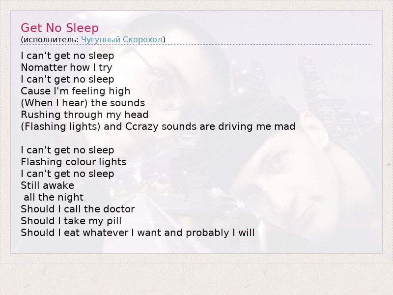 I can't get no sleep Nomatter how I try I can't get no sleep Cause I'm feeling high (When I hear) the sounds Rushing through my head (Flashing lights) and Ccrazy sounds are driving me mad I can't get no sleep Flashing colour lights I can't get no sleep Still awake all the night Should I call the doctor Should I take my pill Should I eat whatever I want and probably I will