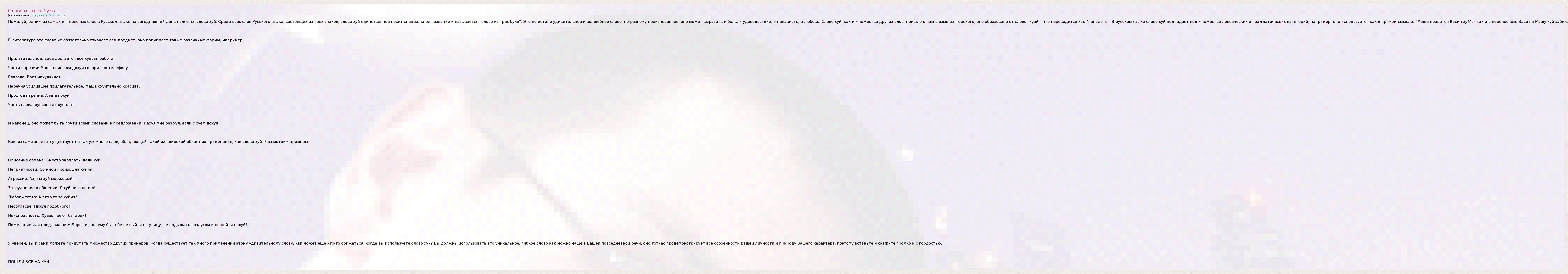 Пожалуй, одним из самых интересных слов в Русском языке на сегодняшний день является слово хуй. Среди всех слов Русского языка, состоящих из трех знаков, слово хуй единственное носит специальное название и называется "слово из трех букв". Это по истине удивительное и волшебное слово, по-разному произнесенное, оно может выразить и боль, и удовольствие, и ненависть, и любовь. Слово хуй, как и множество других слов, пришло к нам в язык из тюрского, оно образовано от слово "хуай", что переводится как "нападать". В русском языке слово хуй подпадает под множество лексических и грамматических категорий, например: оно используется как в прямом смысле: "Маше нравится Васин хуй", - так и в переносном: Вася на Машу хуй забил. В литературе это слово не обязательно означает сам предмет, оно принимает также различные формы, например: Прилагательное: Васе достается все хуевая работа. Части наречия: Маша слишком дохуя говорит по телефону. Глагола: Вася нахуячился. Наречия усилившее прилагательное: Маша охуительно красива. Простое наречие: А мне похуй. Часть слова: хуесос или хуеплет. И наконец, оно может быть почти всеми словами в предложении: Нахуя мне без хуя, если с хуем дохуя! Как вы сами знаете, существует не так уж много слов, обладающей такой же широкой областью применения, как слово хуй. Рассмотрим примеры: Описание обмана: Вместо зарплаты дали хуй. Неприятности: Со мной произошла хуйня. Агрессии: Ах, ты хуй моржовый! Затруднение в общении: Я хуй чего понял! Любопытство: А это что за хуйня? Несогласие: Нихуя подобного! Неисправность: Хуево греют батареи! Пожелание или предложение: Дорогая, почему бы тебе не выйти на улицу, не подышать воздухом и не пойти нахуй? Я уверен, вы и сами можете придумать множество других примеров. Когда существует так много применений этому удивительному слову, как может еще кто-то обижаться, когда вы используете слово хуй? Вы должны использовать это уникальное, гибкое слово как можно чаще в Вашей повседневной речи, оно тотчас продемонстрирует все особенности Вашей личности и природу Вашего характера, поэтому встаньте и скажите громко и с гордостью: ПОШЛИ ВСЕ НА ХУЙ!