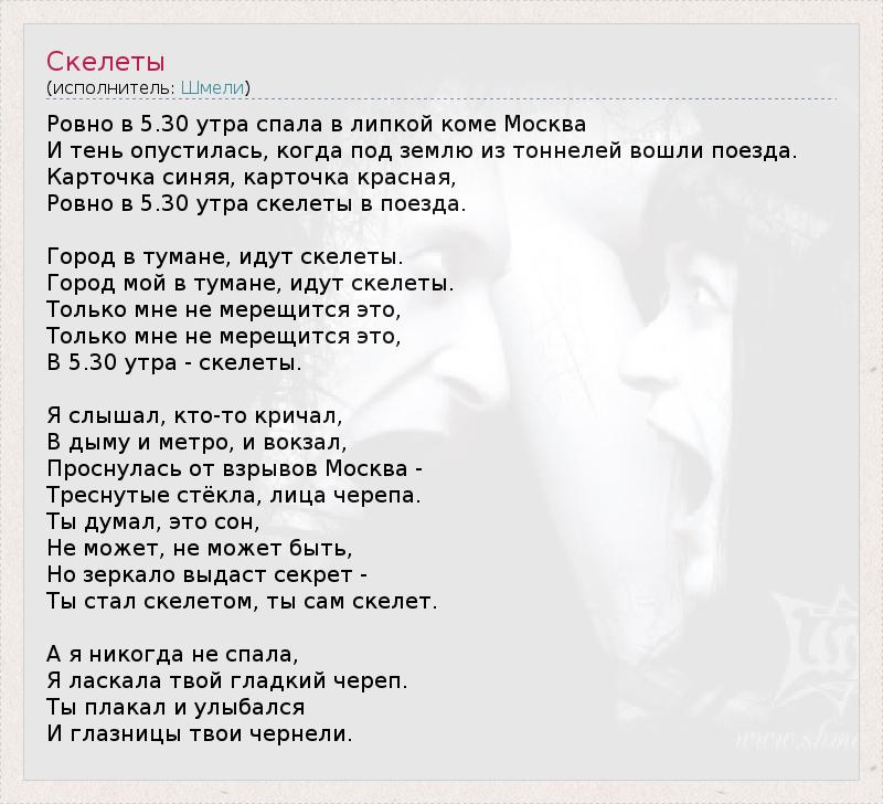 Ровно в 5.30 утра спала в липкой коме Москва И тень опустилась, когда под землю из тоннелей вошли поезда. Карточка синяя, карточка красная, Ровно в 5.30 утра скелеты в поезда. Город в тумане, идут скелеты. Город мой в тумане, идут скелеты. Только мне не мерещится это, Только мне не мерещится это, В 5.30 утра - скелеты. Я слышал, кто-то кричал, В дыму и метро, и вокзал, Проснулась от взрывов Москва - Треснутые стёкла, лица черепа. Ты думал, это сон, Не может, не может быть, Но зеркало выдаст секрет - Ты стал скелетом, ты сам скелет. А я никогда не спала, Я ласкала твой гладкий череп. Ты плакал и улыбался И глазницы твои чернели.