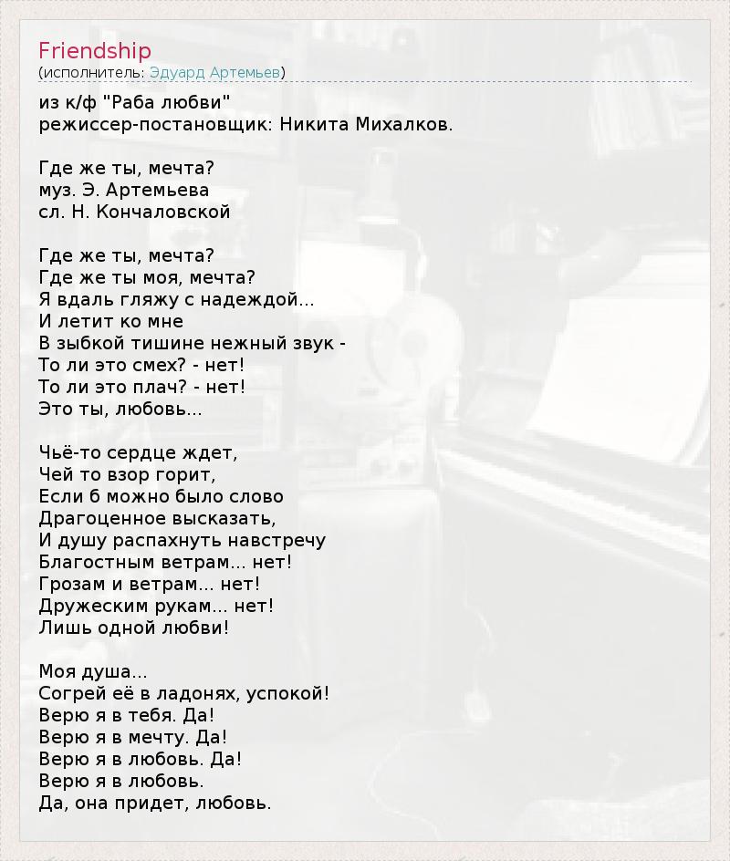 из к/ф "Раба любви" pежиссер-постановщик: Никита Михалков. Где же ты, мечта? муз. Э. Артемьева сл. Н. Кончаловской Где же ты, мечта? Где же ты моя, мечта? Я вдаль гляжу с надеждой... И летит ко мне В зыбкой тишине нежный звук - То ли это смех? - нет! То ли это плач? - нет! Это ты, любовь... Чьё-то сердце ждет, Чей то взор горит, Если б можно было слово Драгоценное высказать, И душу распахнуть навстречу Благостным ветрам... нет! Грозам и ветрам... нет! Дружеским рукам... нет! Лишь одной любви! Моя душа... Согрей её в ладонях, успокой! Верю я в тебя. Да! Верю я в мечту. Да! Верю я в любовь. Да! Верю я в любовь. Да, она придет, любовь.