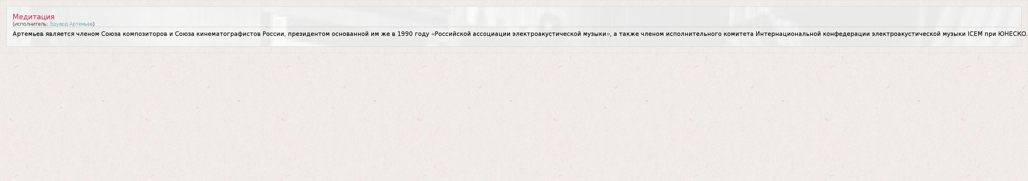 Это интересно:Эдуард Николаевич Артемьев (родился 30 ноября 1937 года в Новосибирске) — русский советский композитор в жанре электронной музыки. Известен, в частности, как автор музыки к фильмам Андрея Тарковского, Никиты Михалкова и Андрея Кончаловского. Живёт и работает в Москве. Отец Артемия Артемьева — музыканта и владельца лэйбла «Электрошок Рекордз». Мэтр российской и советской электронной музыки.Артемьев... продолжение