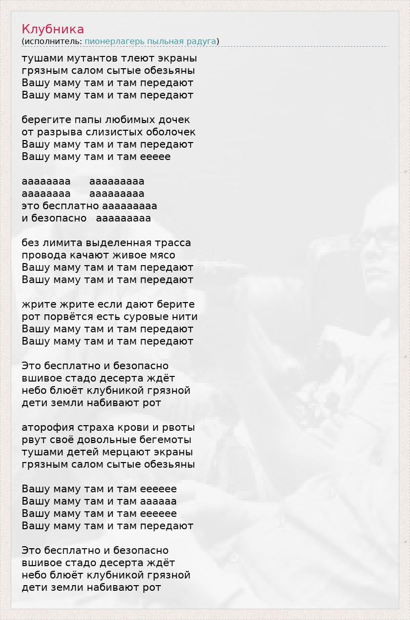 тушами мутантов тлеют экраны грязным салом сытые обезьяны Вашу маму там и там передают Вашу маму там и там передают берегите папы любимых дочек от разрыва слизистых оболочек Вашу маму там и там передают Вашу маму там и там еееее аааааааа ааааааааа аааааааа ааааааааа это бесплатно ааааааааа и безопасно ааааааааа без лимита выделенная трасса провода качают живое мясо Вашу маму там и там передают Вашу маму там и там передают жрите жрите если дают берите рот порвётся есть суровые нити Вашу маму там и там передают Вашу маму там и там передают Это бесплатно и безопасно вшивое стадо десерта ждёт небо блюёт клубникой грязной дети земли набивают рот аторофия страха крови и рвоты рвут своё довольные бегемоты тушами детей мерцают экраны грязным салом сытые обезьяны Вашу маму там и там ееееее Вашу маму там и там аааааа Вашу маму там и там ееееее Вашу маму там и там передают Это бесплатно и безопасно вшивое стадо десерта ждёт небо блюёт клубникой грязной дети земли набивают рот
