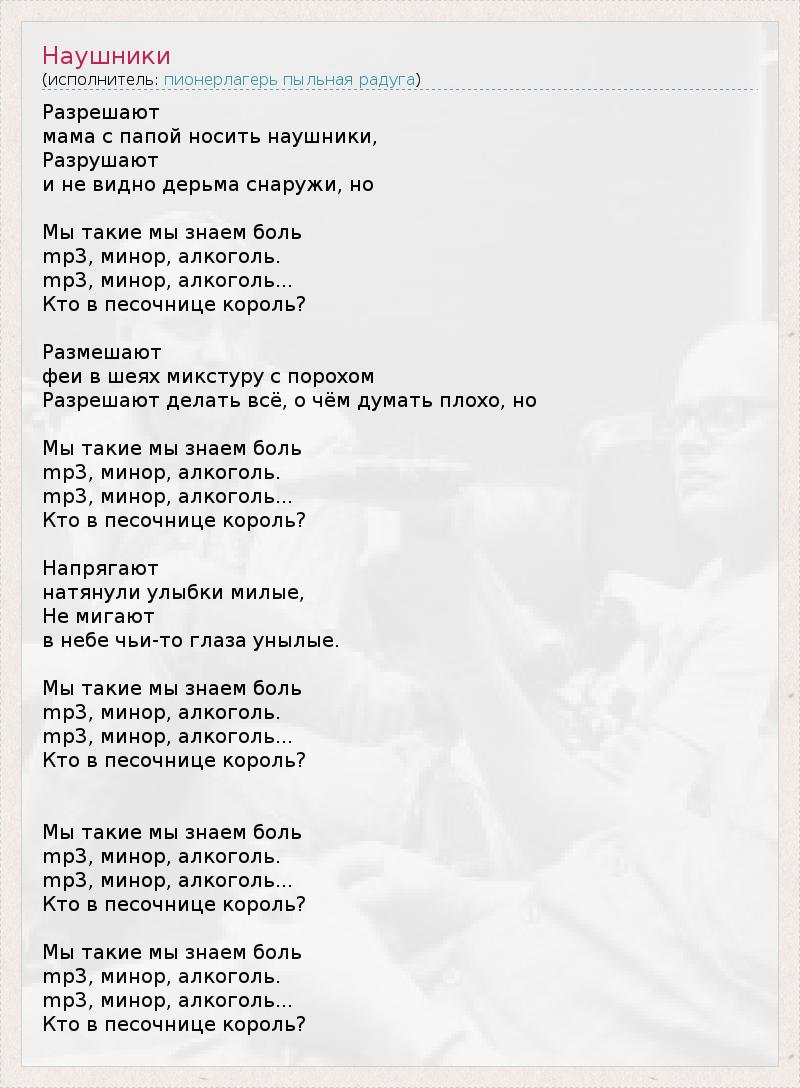 Разрешают мама с папой носить наушники, Разрушают и не видно дерьма снаружи, но Мы такие мы знаем боль mp3, минор, алкоголь. mp3, минор, алкоголь... Кто в песочнице король? Размешают феи в шеях микстуру с порохом Разрешают делать всё, о чём думать плохо, но Мы такие мы знаем боль mp3, минор, алкоголь. mp3, минор, алкоголь... Кто в песочнице король? Напрягают натянули улыбки милые, Не мигают в небе чьи-то глаза унылые. Мы такие мы знаем боль mp3, минор, алкоголь. mp3, минор, алкоголь... Кто в песочнице король? Мы такие мы знаем боль mp3, минор, алкоголь. mp3, минор, алкоголь... Кто в песочнице король? Мы такие мы знаем боль mp3, минор, алкоголь. mp3, минор, алкоголь... Кто в песочнице король?