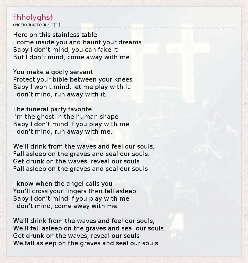 Here on this stainless table I come inside you and haunt your dreams Baby I don't mind, you can fake it But I don't mind, come away with me. You make a godly servant Protect your bible between your knees Baby I won t mind, let me play with it I don't mind, run away with it. The funeral party favorite I'm the ghost in the human shape Baby I don't mind if you play with me I don't mind, run away with me. We'll drink from the waves and feel our souls, Fall asleep on the graves and seal our souls. Get drunk on the waves, reveal our souls Fall asleep on the graves and seal our souls I know when the angel calls you You'll cross your fingers then fall asleep Baby i don't mind if you play with me i don't mind, come away with me We'll drink from the waves and feel our souls, We ll fall asleep on the graves and seal our souls. Get drunk on the waves, reveal our souls We fall asleep on the graves and seal our souls.