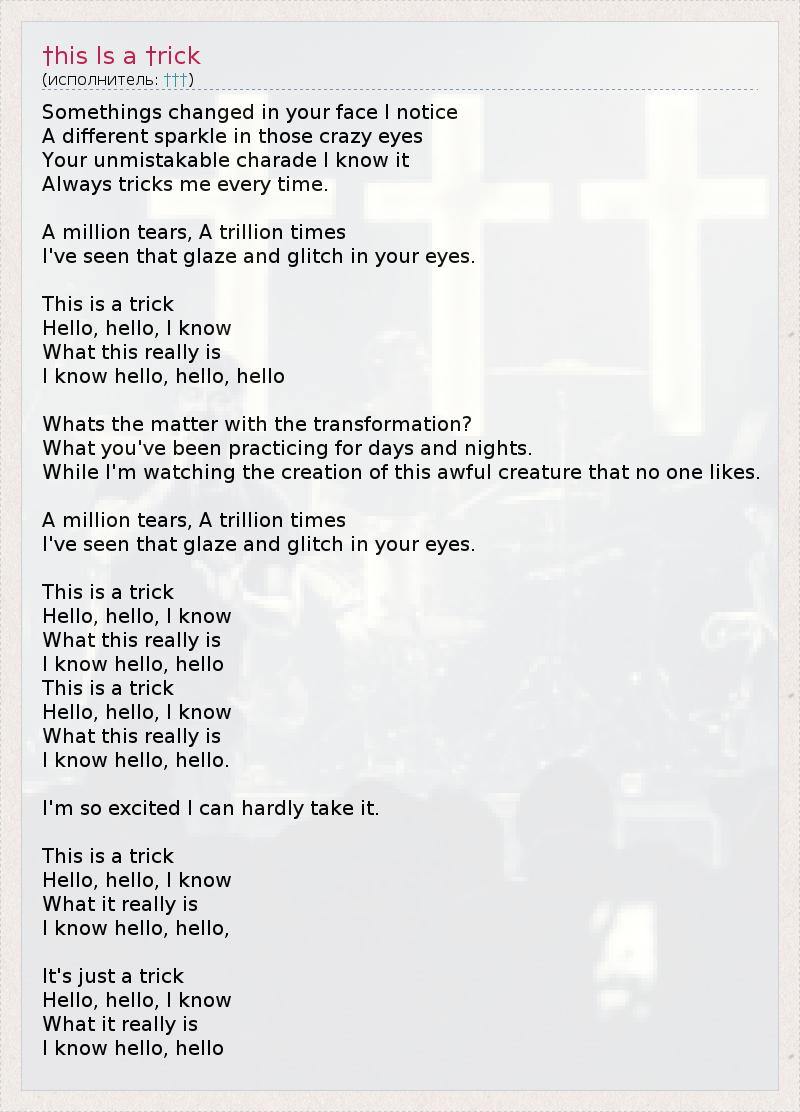 Somethings changed in your face I notice A different sparkle in those crazy eyes Your unmistakable charade I know it Always tricks me every time. A million tears, A trillion times I've seen that glaze and glitch in your eyes. This is a trick Hello, hello, I know What this really is I know hello, hello, hello Whats the matter with the transformation? What you've been practicing for days and nights. While I'm watching the creation of this awful creature that no one likes. A million tears, A trillion times I've seen that glaze and glitch in your eyes. This is a trick Hello, hello, I know What this really is I know hello, hello This is a trick Hello, hello, I know What this really is I know hello, hello. I'm so excited I can hardly take it. This is a trick Hello, hello, I know What it really is I know hello, hello, It's just a trick Hello, hello, I know What it really is I know hello, hello