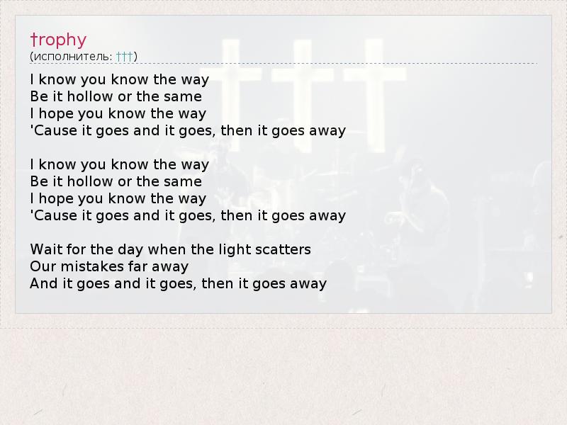 I know you know the way Be it hollow or the same I hope you know the way 'Cause it goes and it goes, then it goes away I know you know the way Be it hollow or the same I hope you know the way 'Cause it goes and it goes, then it goes away Wait for the day when the light scatters Our mistakes far away And it goes and it goes, then it goes away