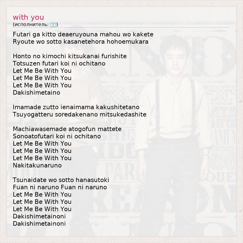 Futari ga kitto deaeruyouna mahou wo kakete Ryoute wo sotto kasanetehora hohoemukara Honto no kimochi kitsukanai furishite Totsuzen futari koi ni ochitano Let Me Be With You Let Me Be With You Let Me Be With You Dakishimetaino Imamade zutto ienaimama kakushitetano Tsuyogatteru soredakenano mitsukedashite Machiawasemade atogofun mattete Sonoatofutari koi ni ochitano Let Me Be With You Let Me Be With You Let Me Be With You Nakitakunaruno Tsunaidate wo sotto hanasutoki Fuan ni naruno Fuan ni naruno Let Me Be With You Let Me Be With You Let Me Be With You Dakishimetainoni Dakishimetainoni