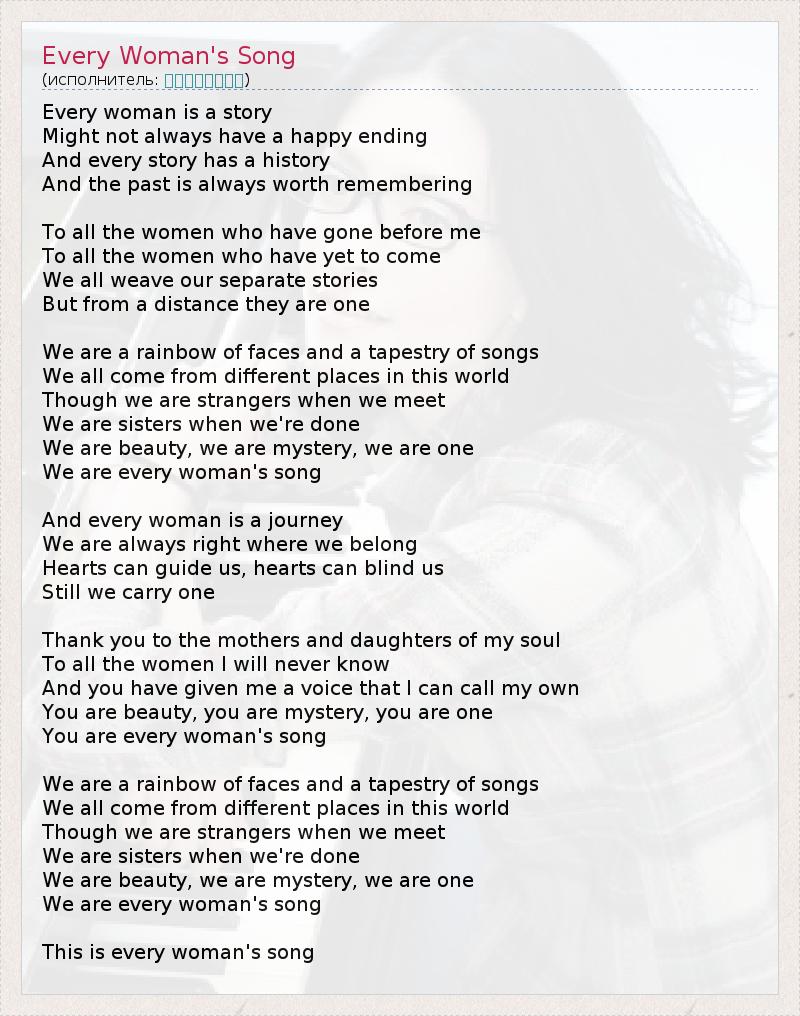 Каждая женщина - это история. Конечно, не всегда со счастливым концом. А каждая история имеет предысторию, Ведь прошлое всегда стоит помнить. Всем женщинами, которые были до меня, Всем женщинам, которые будут после - Мы все сотканы из наших отдельных историй, Но со стороны они кажутся одной. Мы радуга лиц и полотно песен. Мы приходим из разных мест этого мира. Хотя мы и незнакомцы при встрече, При расставании - мы сёстры. Мы красивы, мы загадочны, мы едины. Мы - песня каждой женщины. И каждая женщина - путешествие. Мы всегда там, где мы нужны. Сердца ведут нас, сердца слепят нас, И всё же, оно есть у каждого. Спасибо вам, матери и дочери моей души, Женщины, которых я никогда не узнаю. Все вы дали мне голос, который я могу назвать своим. Вы красивы, вы загадочны, вы едины, Вы - песня каждой женщины. Мы радуга лиц и полотно песен. Мы приходим из разных мест этого мира. Хотя мы и незнакомцы при встрече, Мы становимся сестрами, когда познакомимся. Мы красивы, мы загадочны, мы едины. Мы - песня каждой женщины. Это песня каждой женщины.