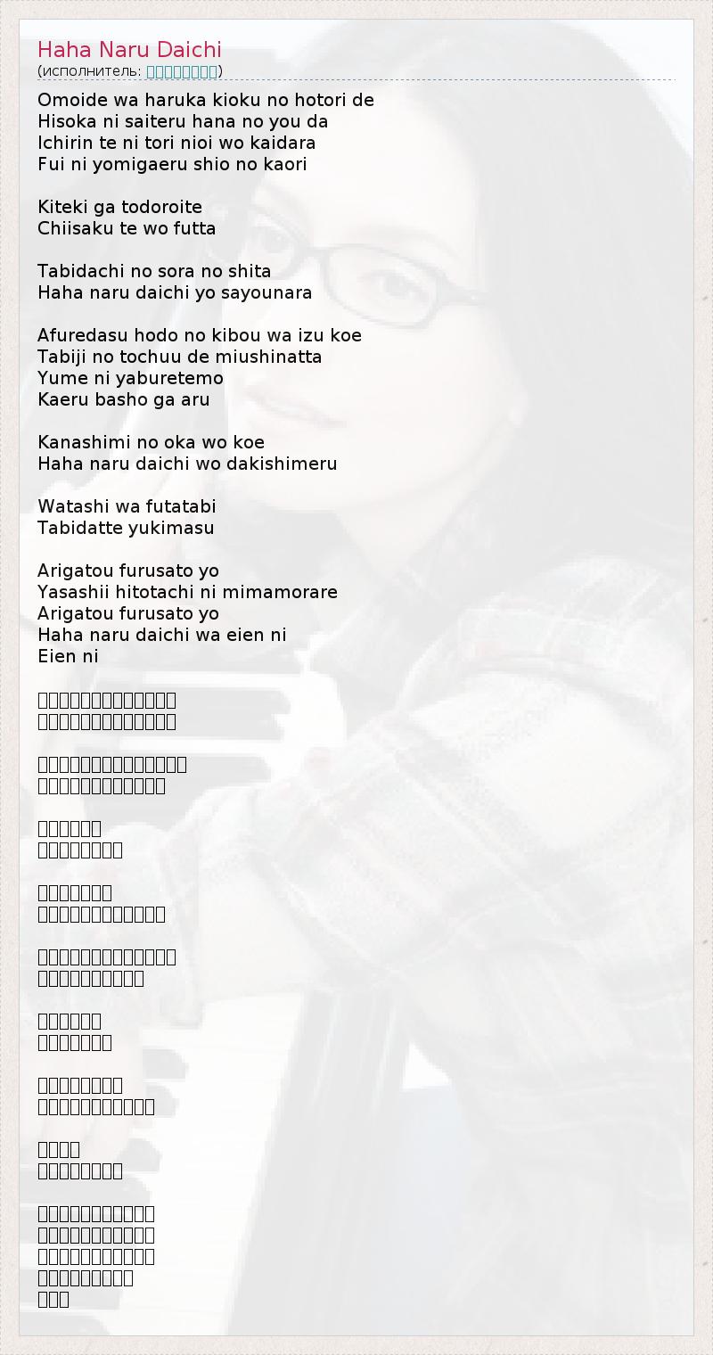 Omoide ва Харука Kioku нет Hotori де Хисока Ni saiteru хана нет, ты да Ichirin Те щ торов nioi горе kaidara Не Fui Ni yomigaeru Шио не Каори Kiteki га todoroite Chiisaku те горе futta Не Tabidachi не Сора не шита Ха-ха нару Daichi лет sayounara Afuredasu Hodo нет Kibou ва Идзу кое Tabiji нет Tochuu де miushinatta Yume Ni yaburetemo Kaeru Басе га Ару Kanashimi No Oka горе кое Ха-ха нару Daichi горе dakishimeru Ватаси ва Futatabi Tabidatte yukimasu Arigatou Фурусато лет Yasashii hitotachi Ni mimamorare Arigatou Фурусато лет Ха-ха нару Daichi ва Eien Ni Eien Ni 思い出 は 遥か 記憶 の ほとり で 密か に 咲い て いる 花 の よう だ 一 輪 手 に 取り におい を かい だら 不意 に よみがえる 潮 の 香り 汽笛 が 轟い て 小さく 手 を 振っ た 旅立ち の 空 の 下 母なる大地 よ さようなら 溢れ 出す ほど の 希望 は 何処 へ 旅路 の 途中 で 見失っ た 夢 に 破れ て も 帰る 場所 が ある 悲しみ の 丘 を 越え 母なる大地 を 抱きしめる 私 は 再び 旅立っ て いき ます ありがとう ふるさと よ 優しい 人 たち に 見守ら れ ありがとう ふるさと よ 母なる大地 は 永遠 に 永遠 に